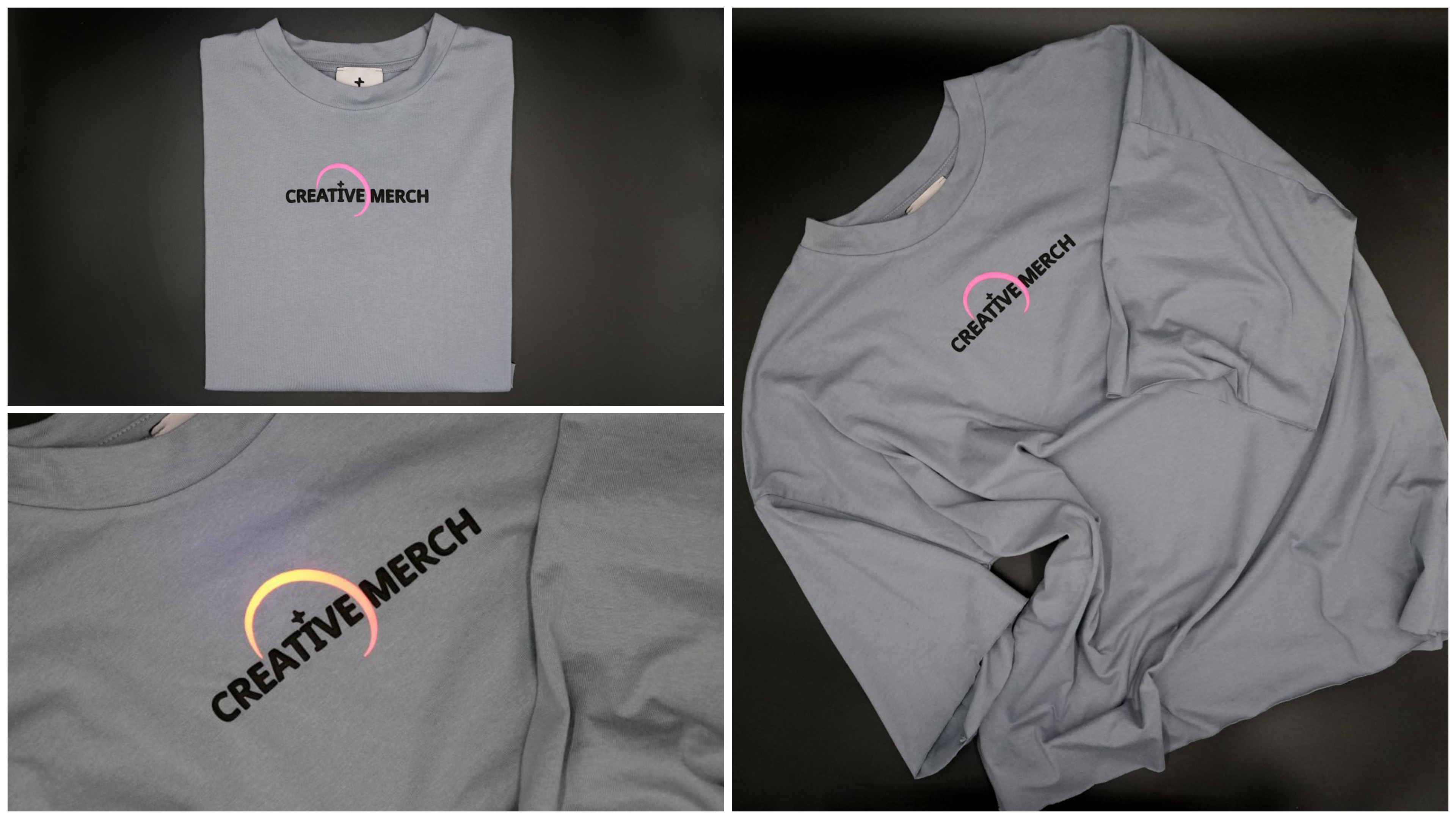 В этом проекте мы работали с технологией, которая даёт сразу два сильных эффекта в одном нанесении: объём и UV-реакцию. Речь о термотрансферной плёнке — флекс-печати (HTV / heat transfer vinyl). Это способ брендирования одежды, где изображение формируется не краской, а плёнкой: она вырезается по контуру и переносится на изделие под температурой и давлением.