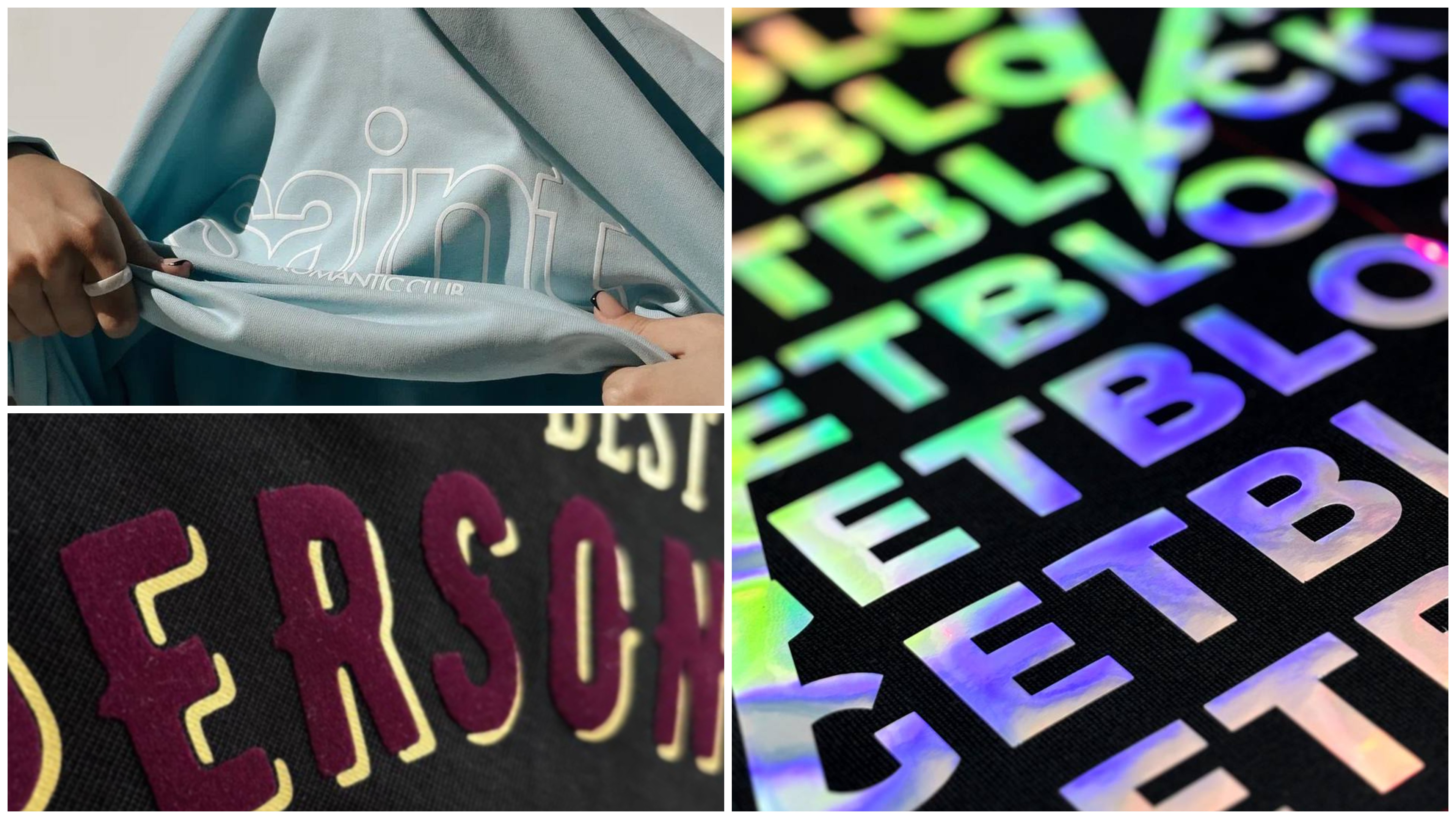 Флекс — это не только матовый чёрный. В работе используются разные материалы под задачу бренда: матовый и глянцевый флекс для чистого минимализма, металлизированные плёнки для акцента, светоотражающий флекс для функционального брендирования, голографические и текстурные плёнки для визуального характера, объёмный флекс для тактильности и рельефа, термохромные решения, когда эффект становится частью айдентики.