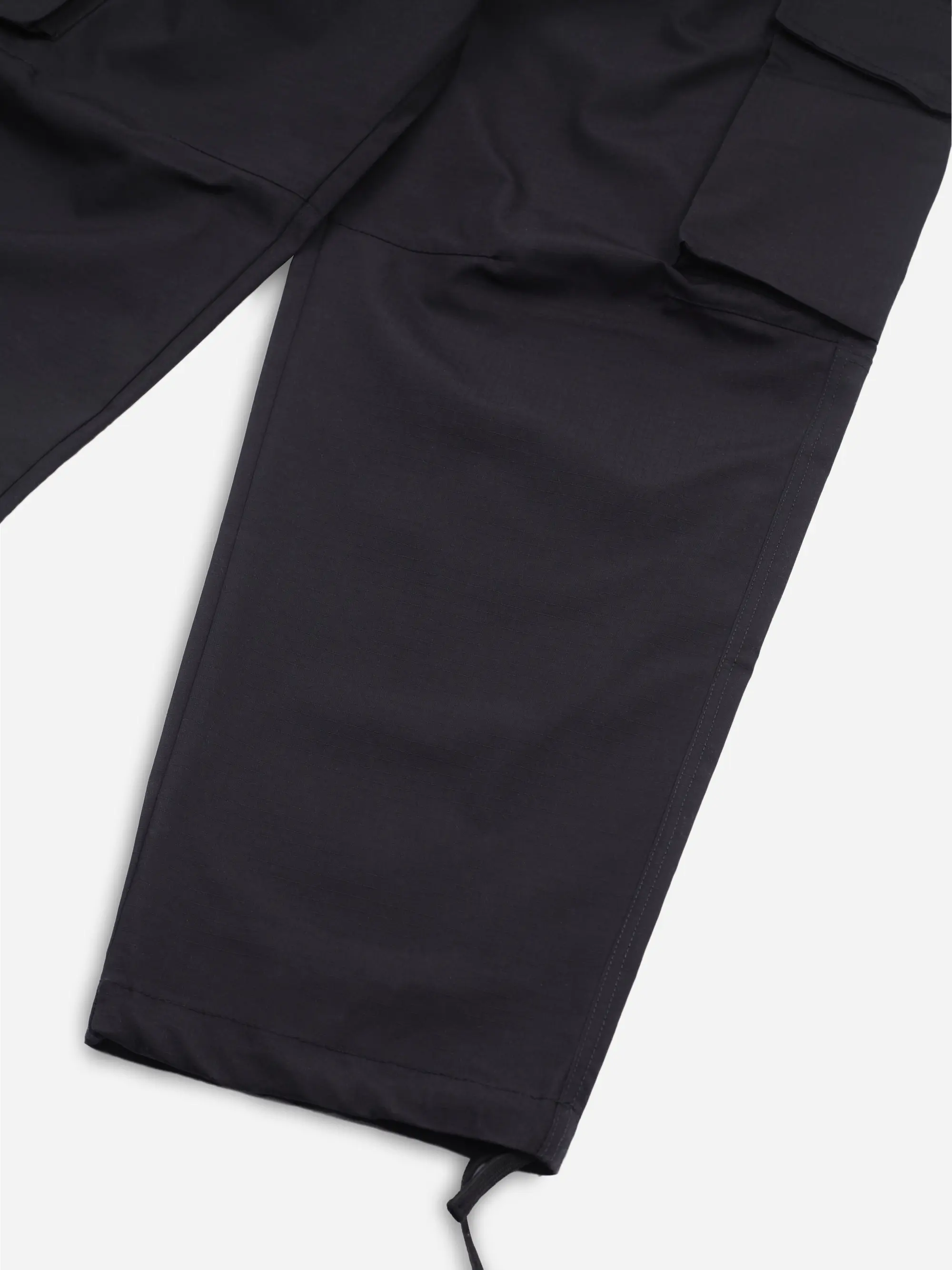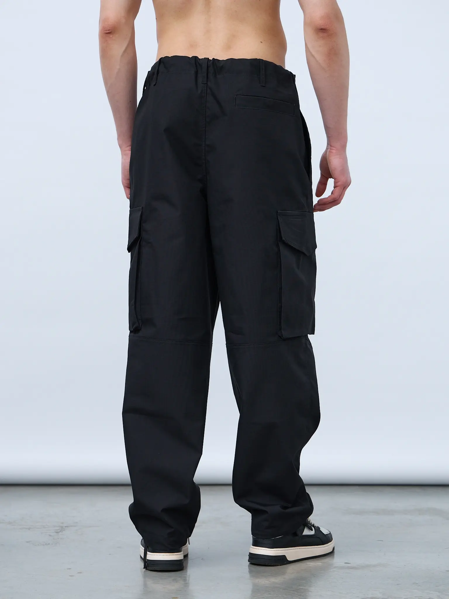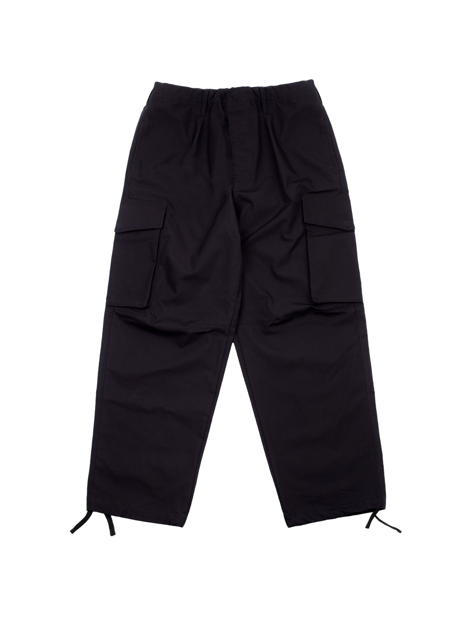 Брюки карго мужские прямого широкого кроя выполнены из смесовой износостойкой ткани рип-стоп, оснащены двумя накладными карманами на кнопках, двумя внутренними боковыми карманами и одним задним карманом на кнопке. На поясе имеется резинка и регулировочный шнурок, застежка на молнии + металлическая кнопка. Низ брючин регулируются шнурком.