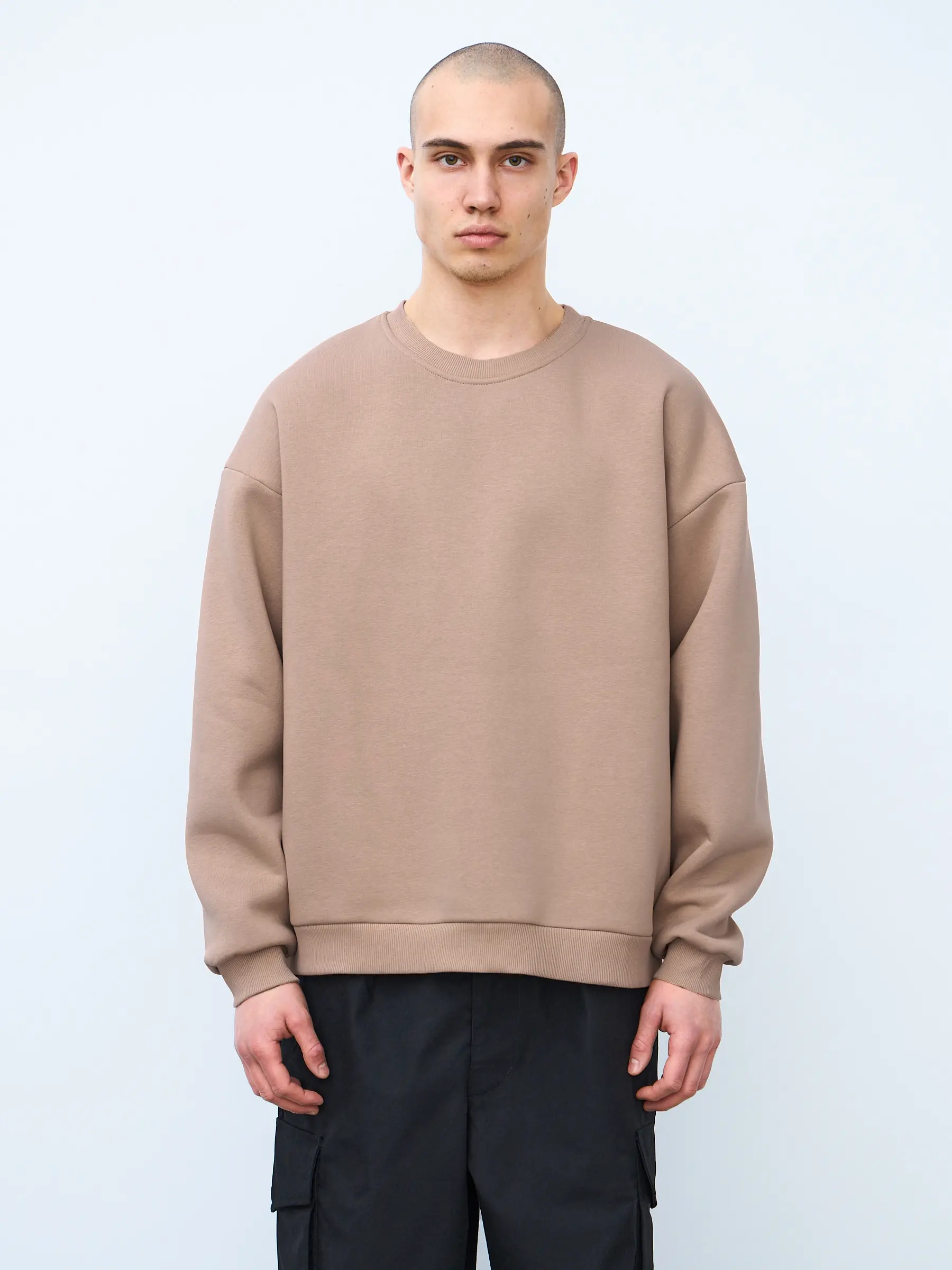 Базовая оверсайз футболка бежевого цвета. Свободный силуэт, умеренный оверсайз и спущенная линия плеча.