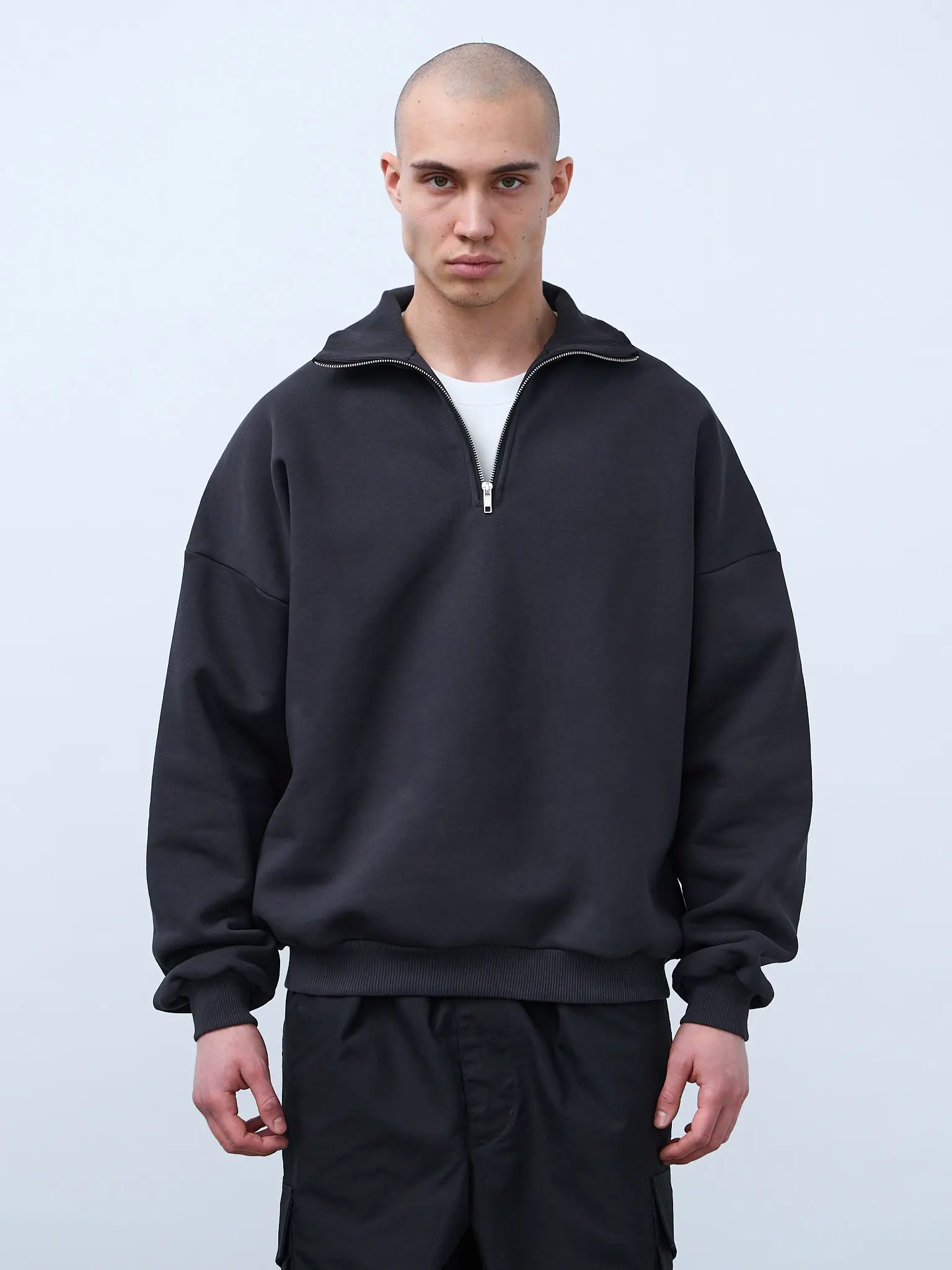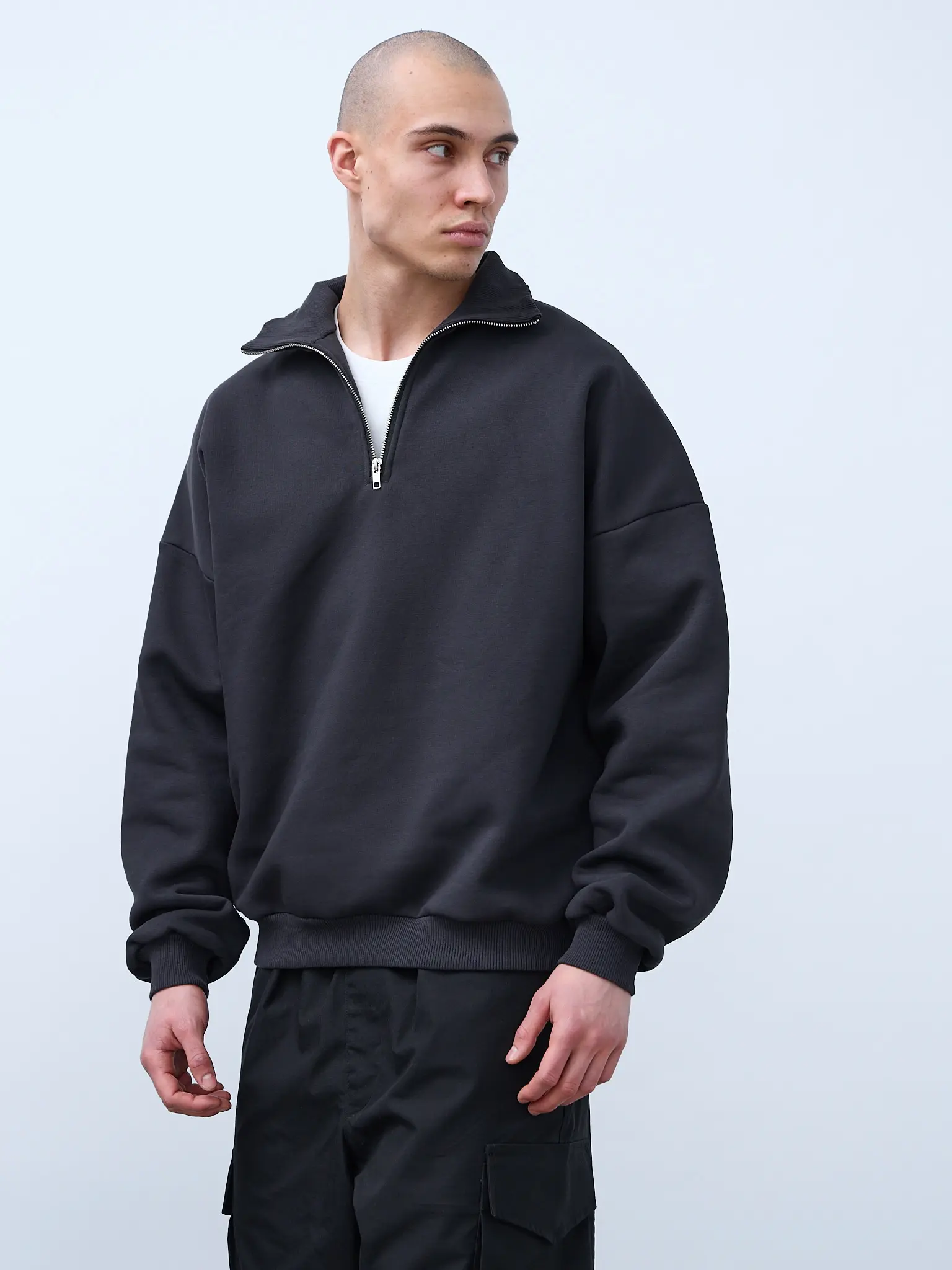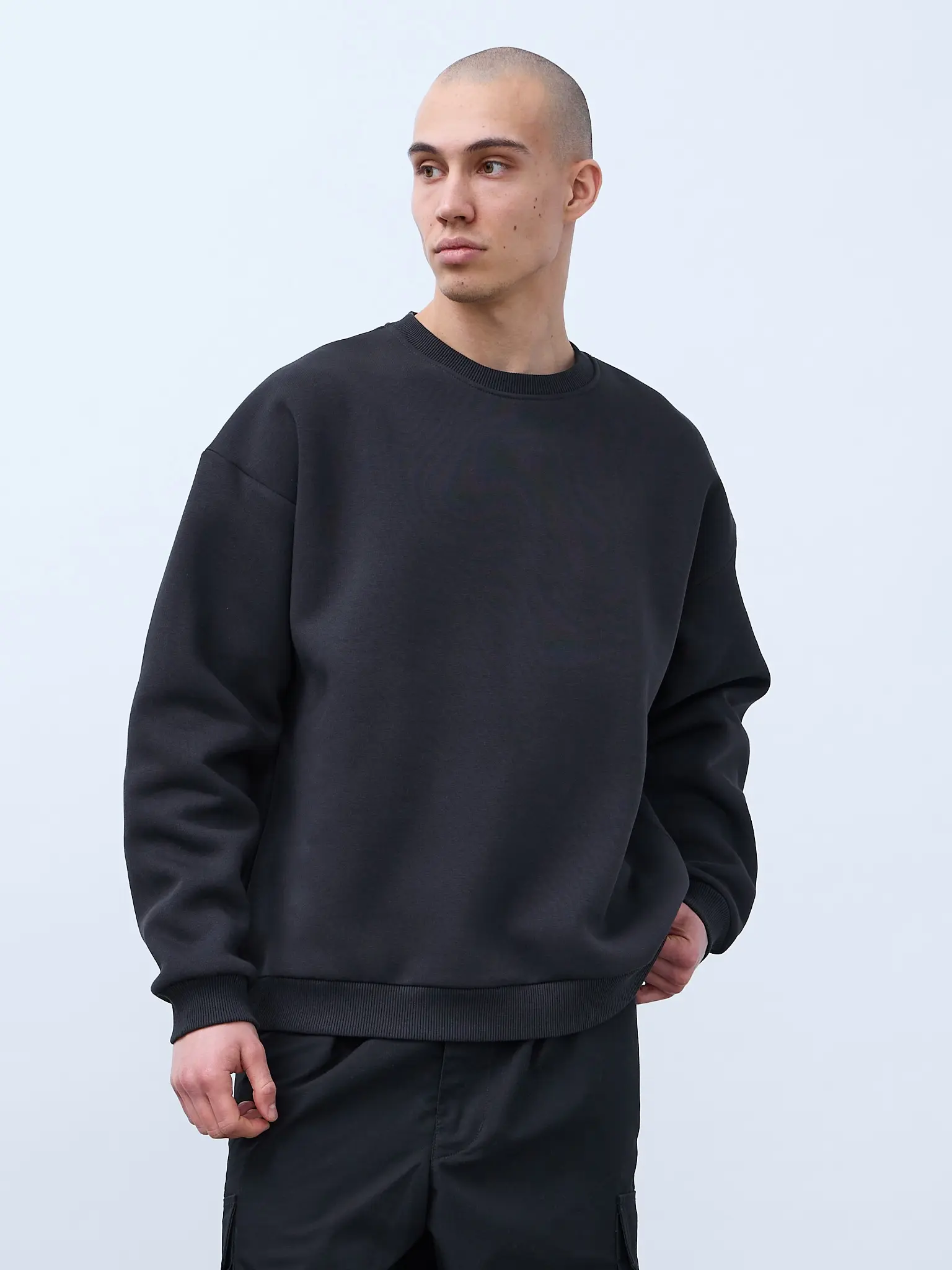 Базовая оверсайз футболка цвета "графит". Свободный силуэт, спущенная линия плеча. Футболка универсальная, для мужчин и женщин. Выполнена из премиального трикотажного полотна "кулирная гладь" качества пенье компакт. Горловина по спинке и плечи усилены бейкой. Плечевой шов выполнен дорогостоящей и сложной обработкой двойным цепным швом. По центру горловины вшит тканевый жаккардовый размерник черного цвета, в боковой внутренний шов футболки вшит составник 100% хлопок с указаниями по уходу. Футболки не имеют брендированных обозначений.
