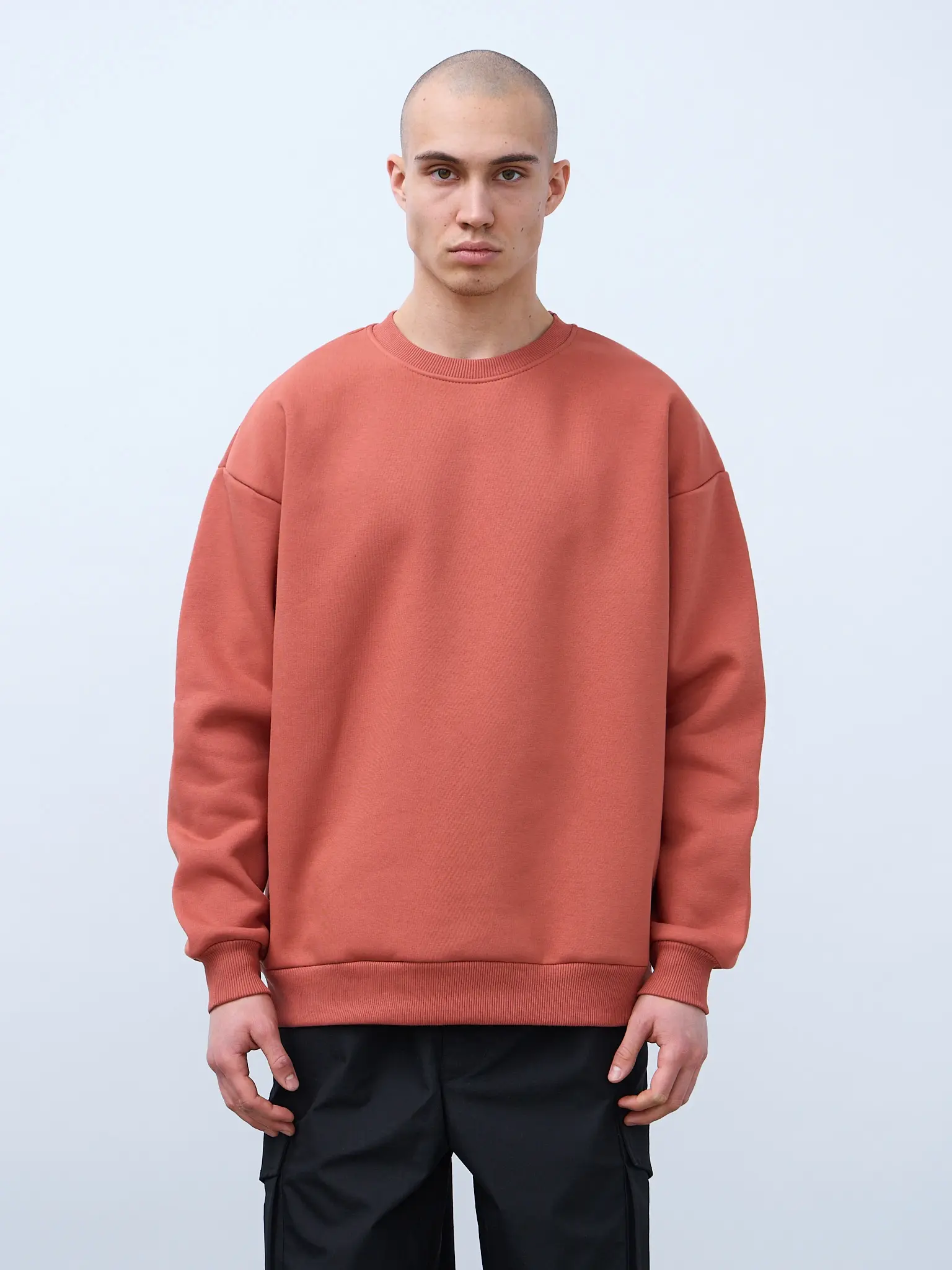 Базовая оверсайз футболка терракотового цвета. Свободный силуэт, умеренный оверсайз и спущенная линия плеча.