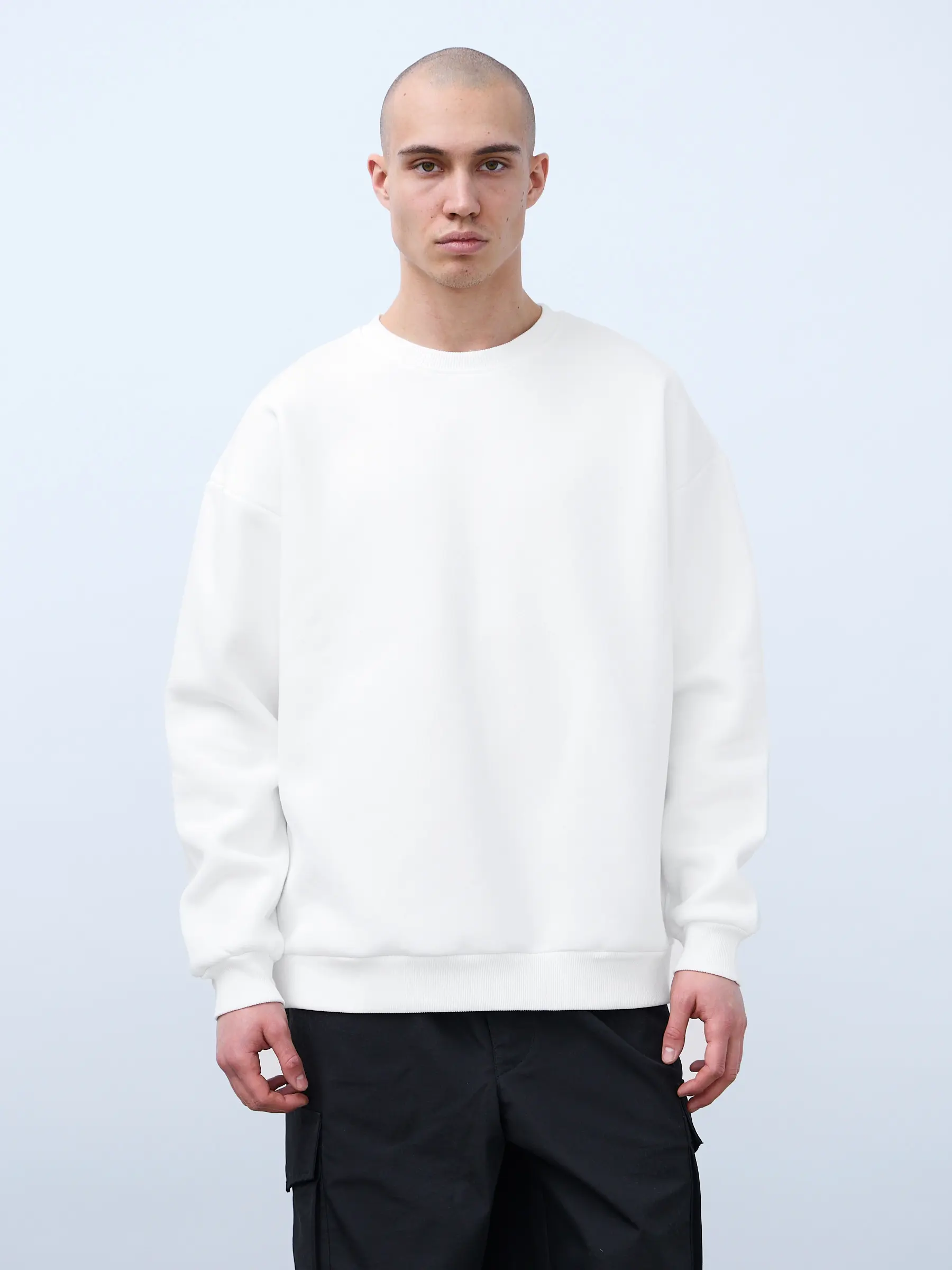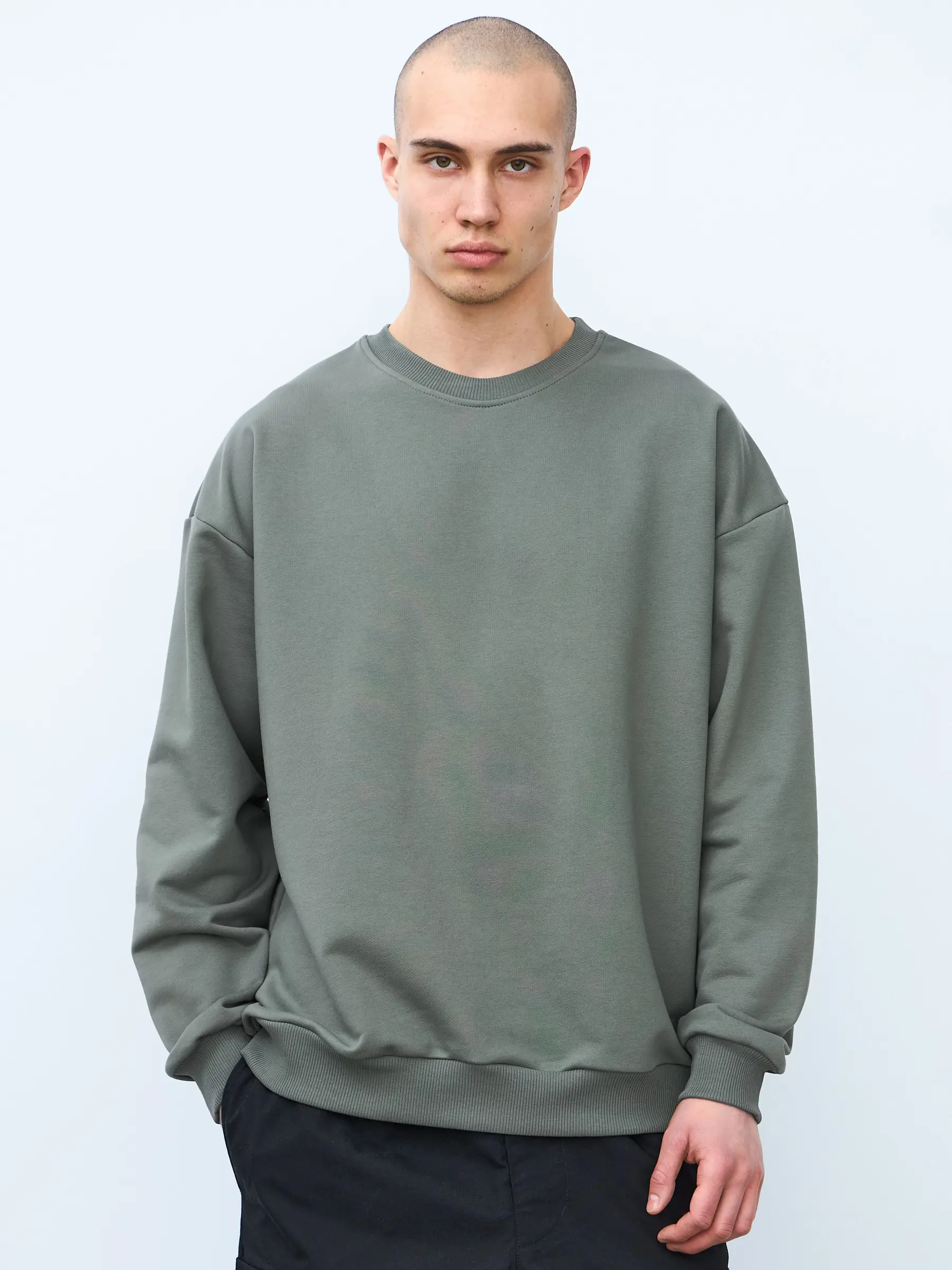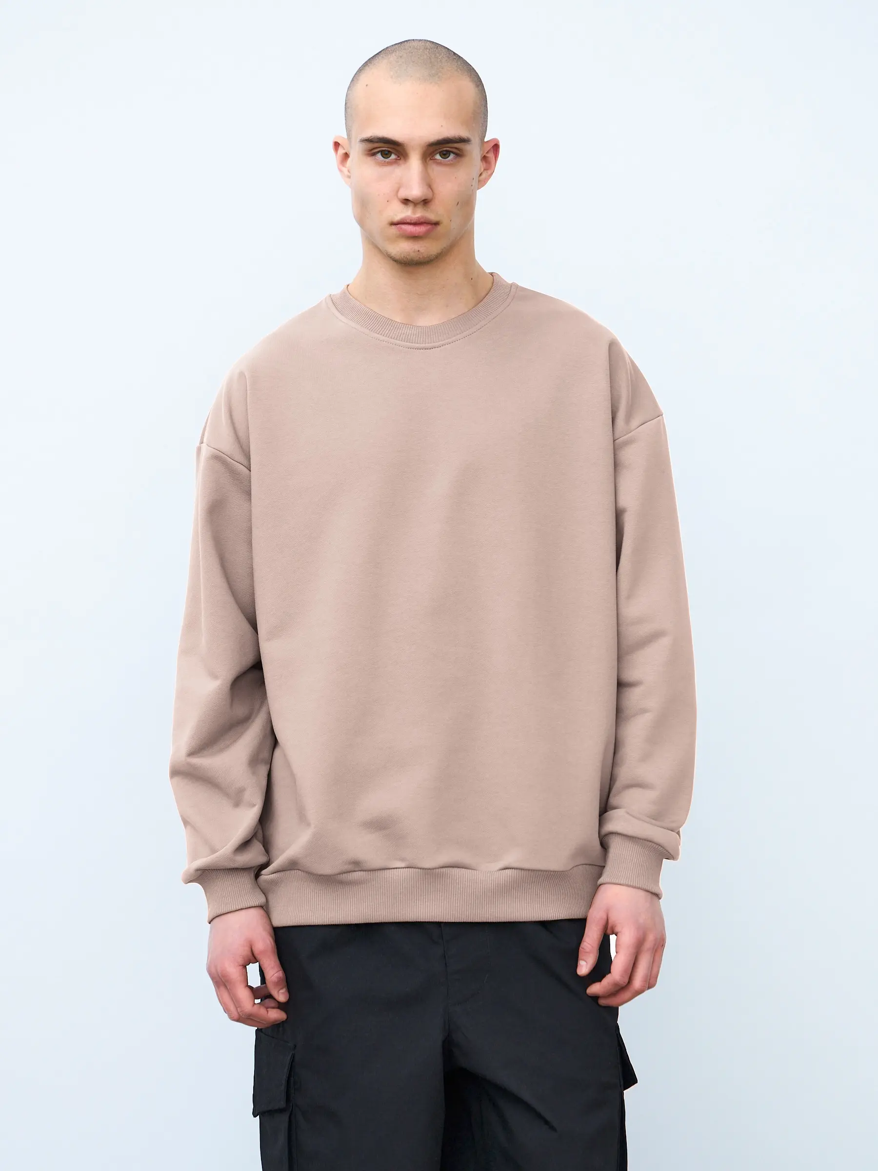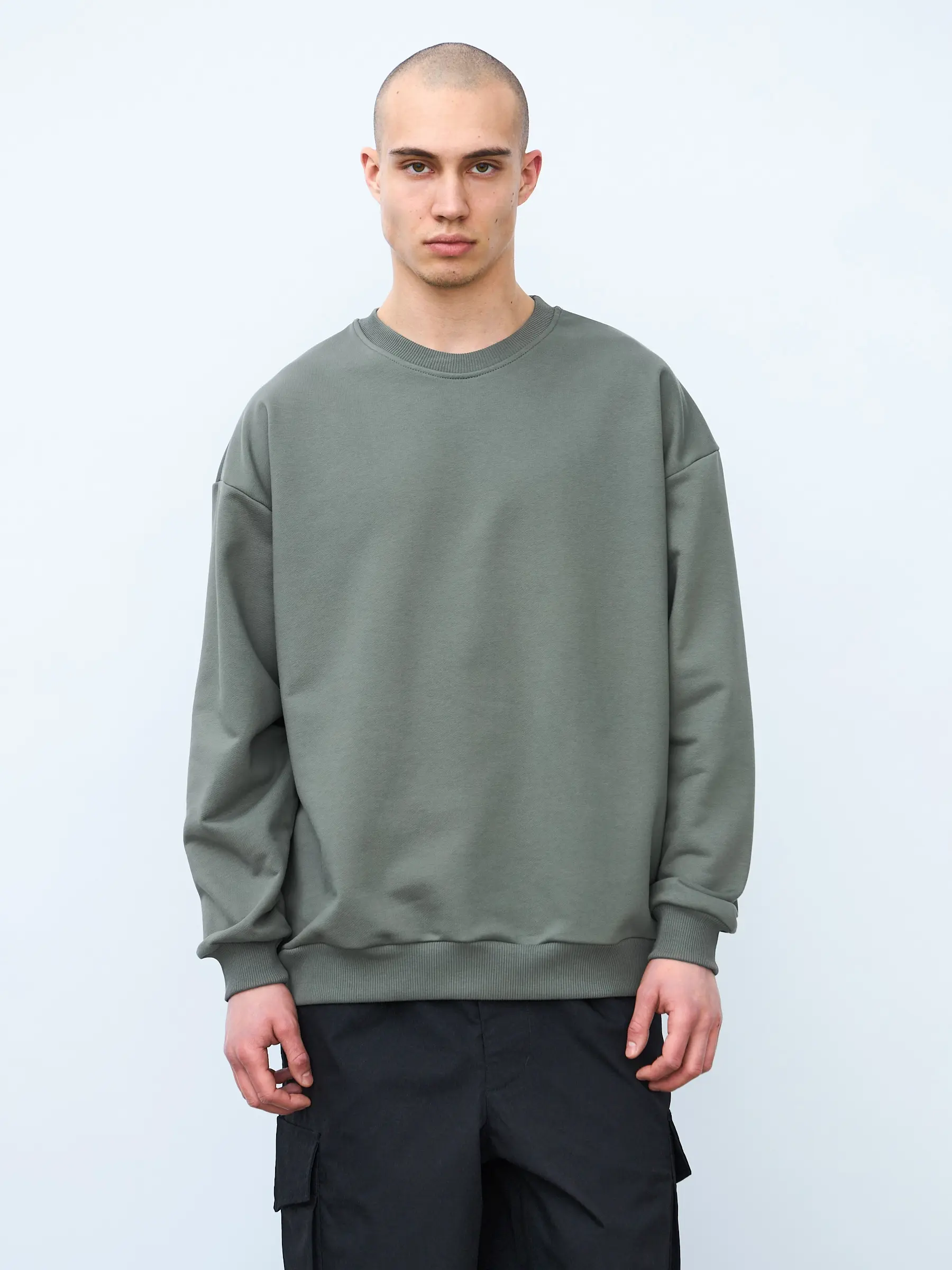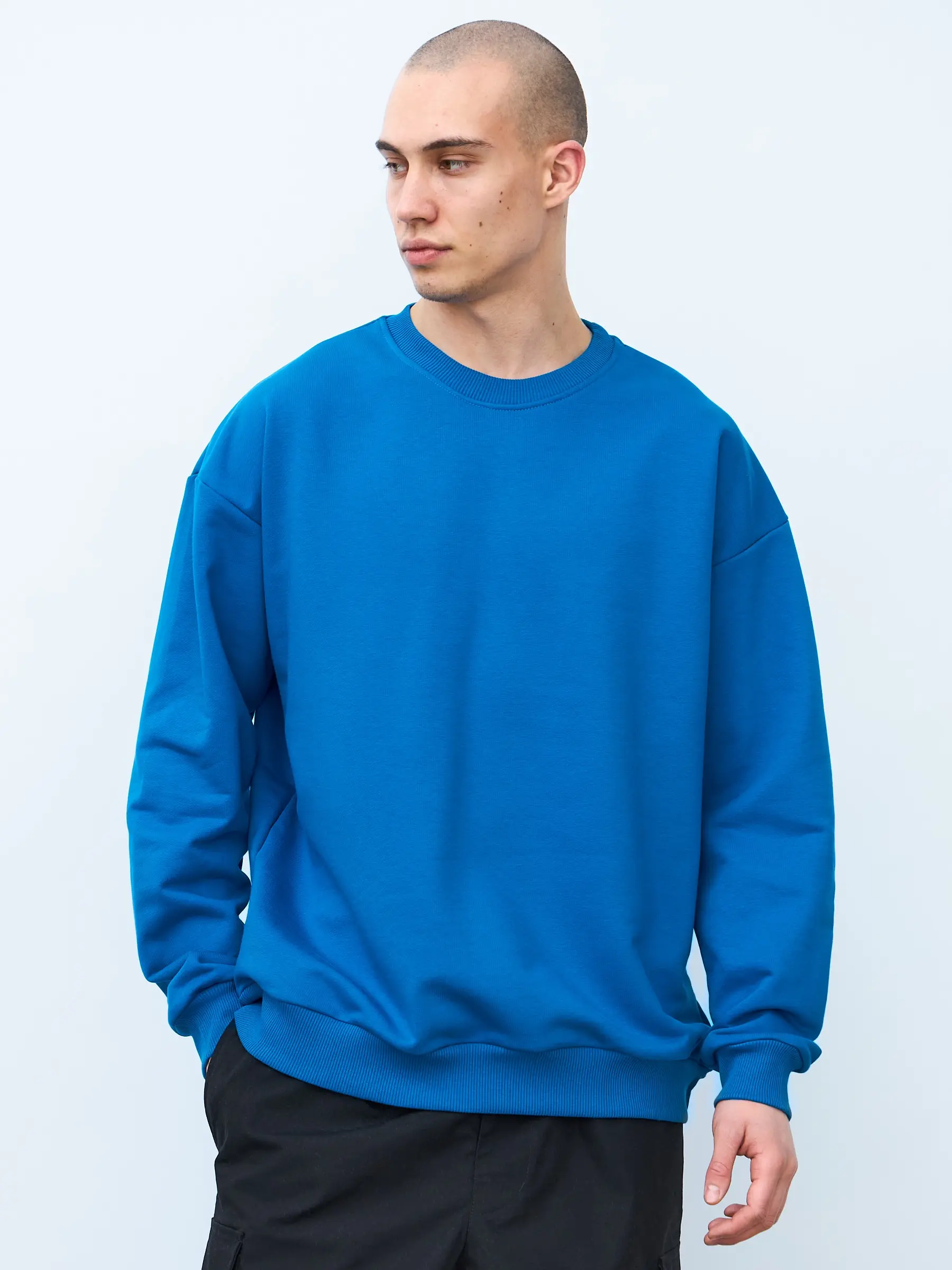 Свитшот оверсайз кроя, выполнен из трикотажного полотна "футер", с петельной изнаночной стороной. Свободный силуэт, средняя длина и спущенная линия плеча. Манжеты и пояс выполнены из ребристого эластичного полотна "кашкорсе". Во внутренней стороне горловина по спинке усилена хлопковой киперной лентой, по центру вшит тканевый жаккардовый размерник черного цвета, на внутреннем боковом шве имеется нейлоновый составник. Толстовки не имеют брендированных обозначений и индивидуально упакованы в ПВД пакет.