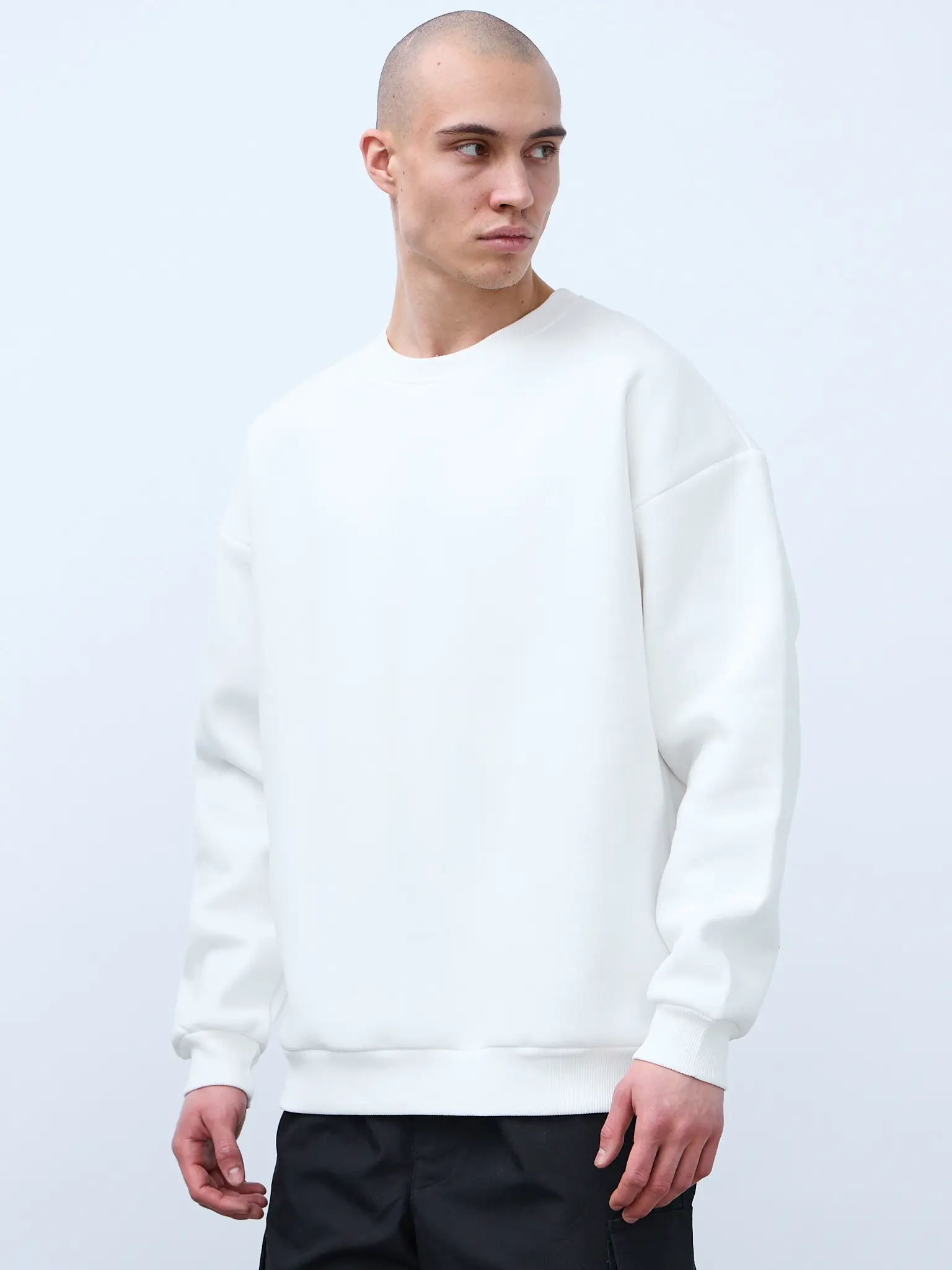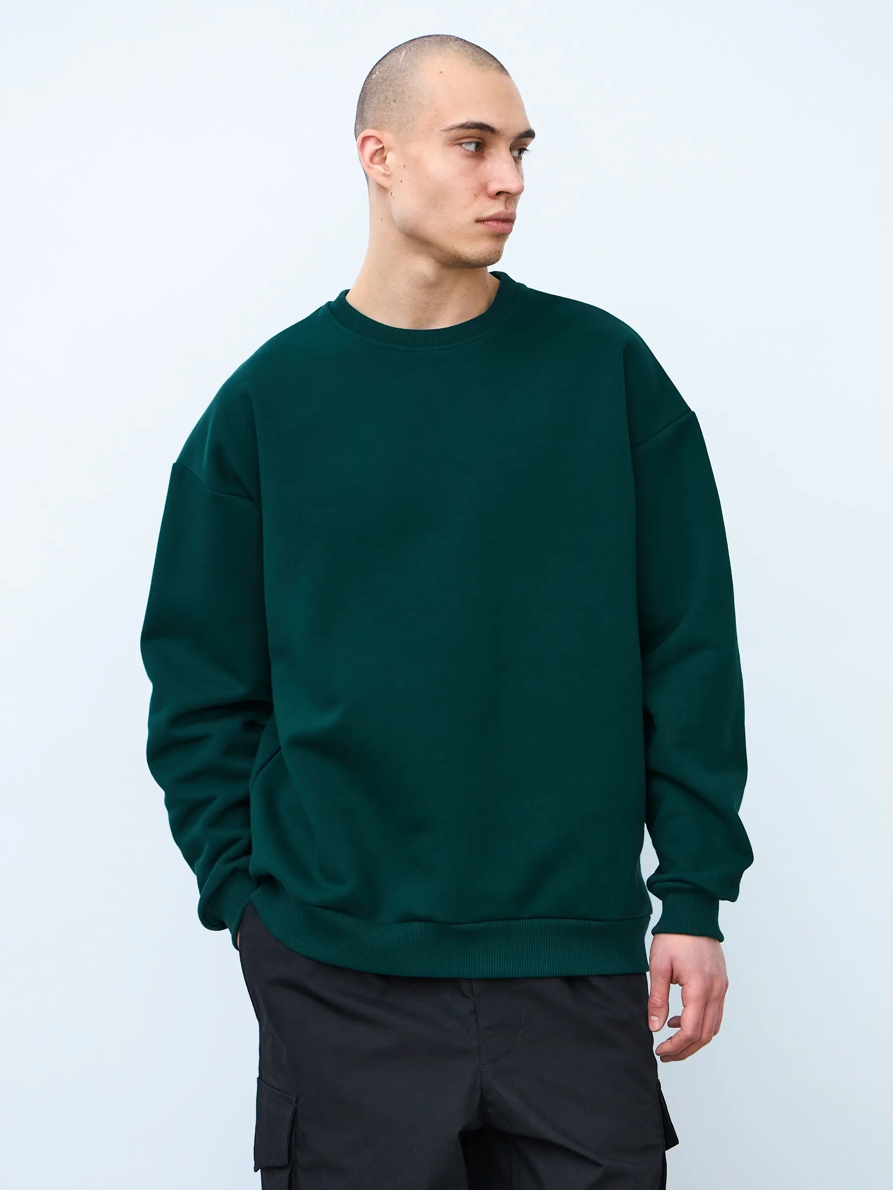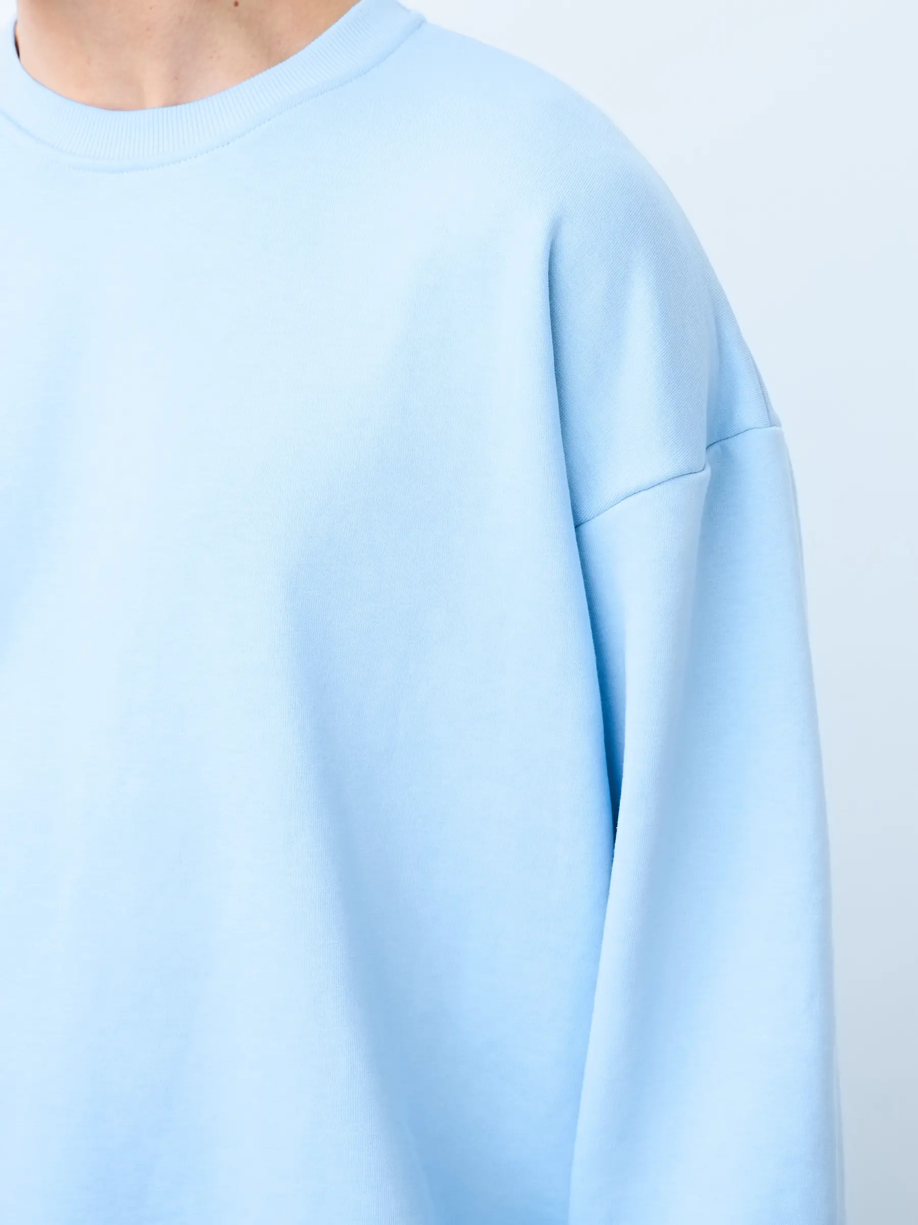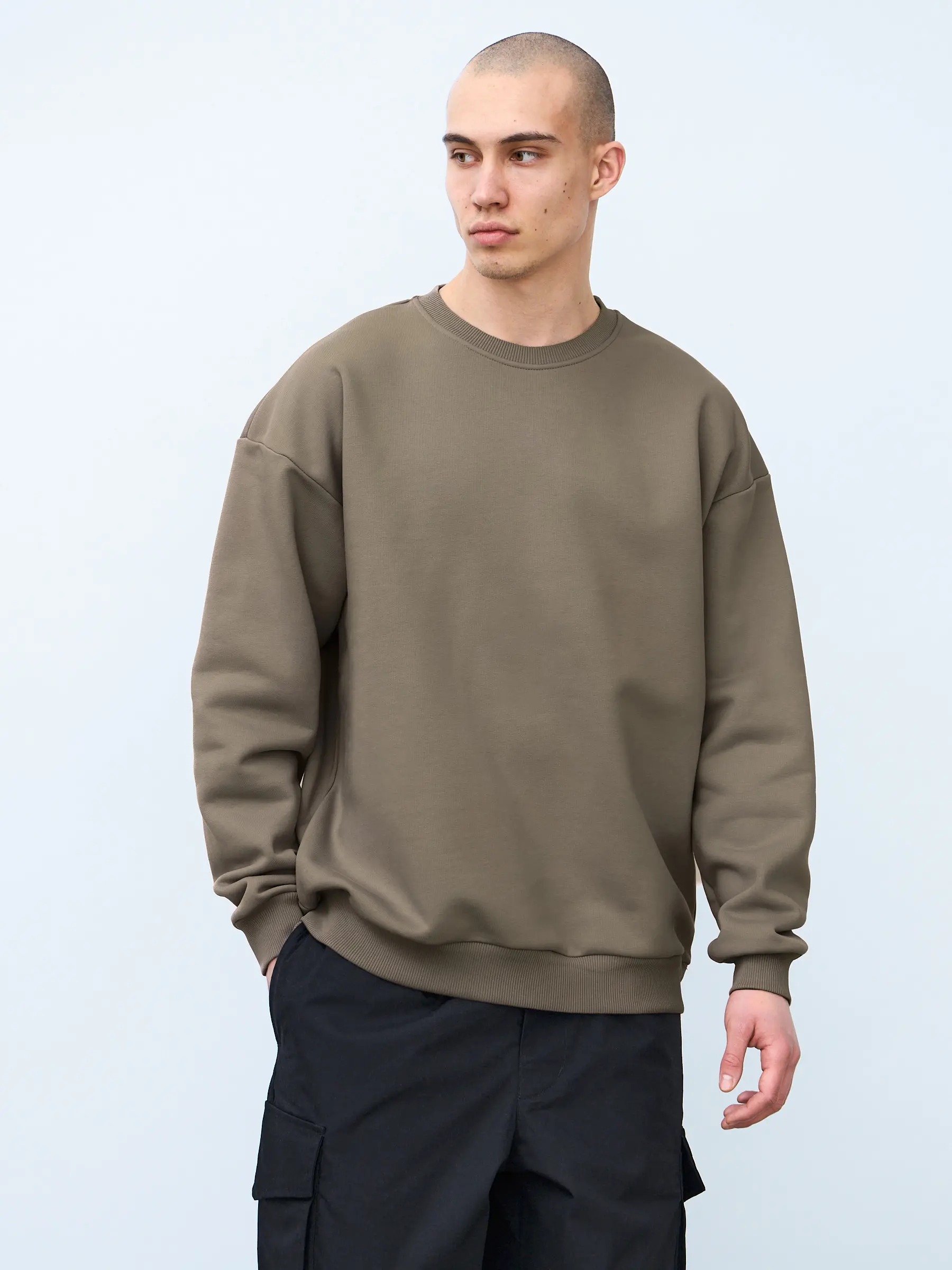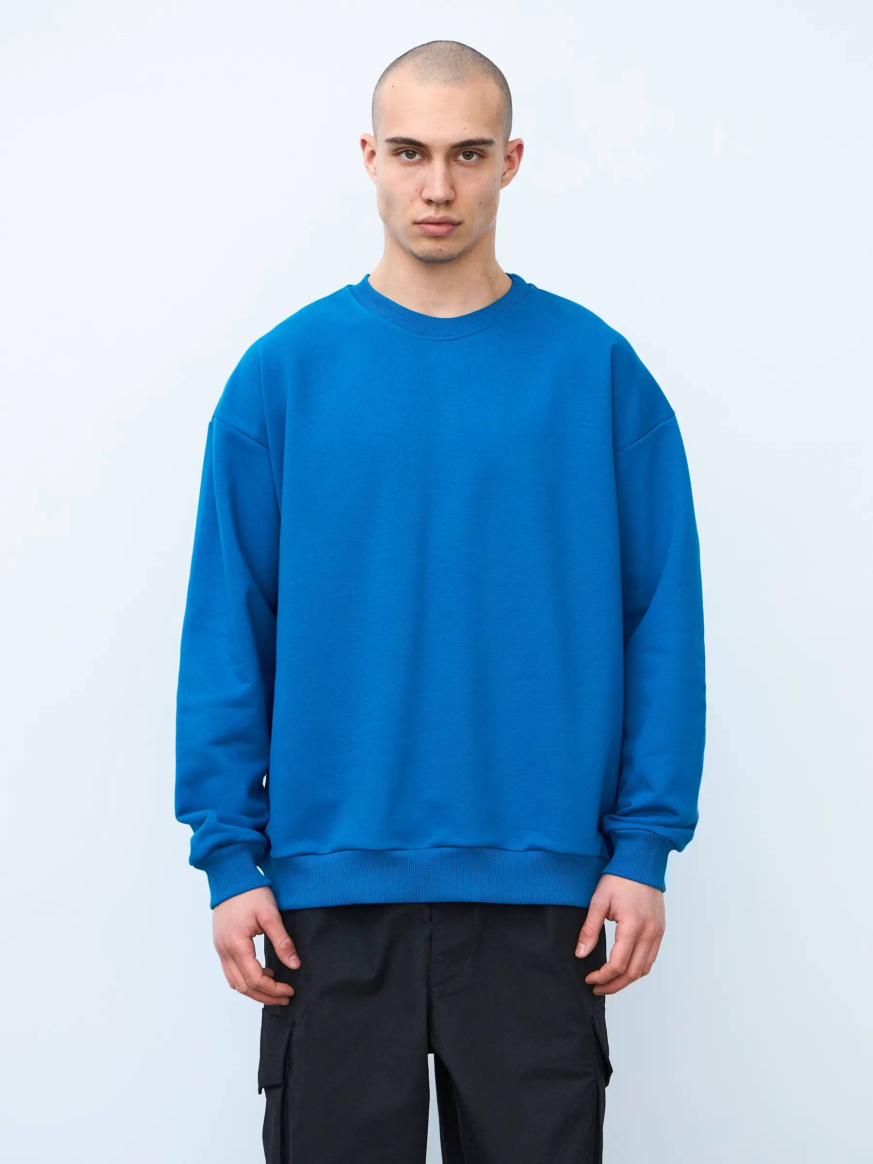 Свитшот оверсайз кроя, выполнен из трикотажного полотна "футер", с петельной изнаночной стороной. Свободный силуэт, средняя длина и спущенная линия плеча. Манжеты и пояс выполнены из ребристого эластичного полотна "кашкорсе". Во внутренней стороне горловина по спинке усилена хлопковой киперной лентой, по центру вшит тканевый жаккардовый размерник черного цвета, на внутреннем боковом шве имеется нейлоновый составник. Толстовки не имеют брендированных обозначений и индивидуально упакованы в ПВД пакет.