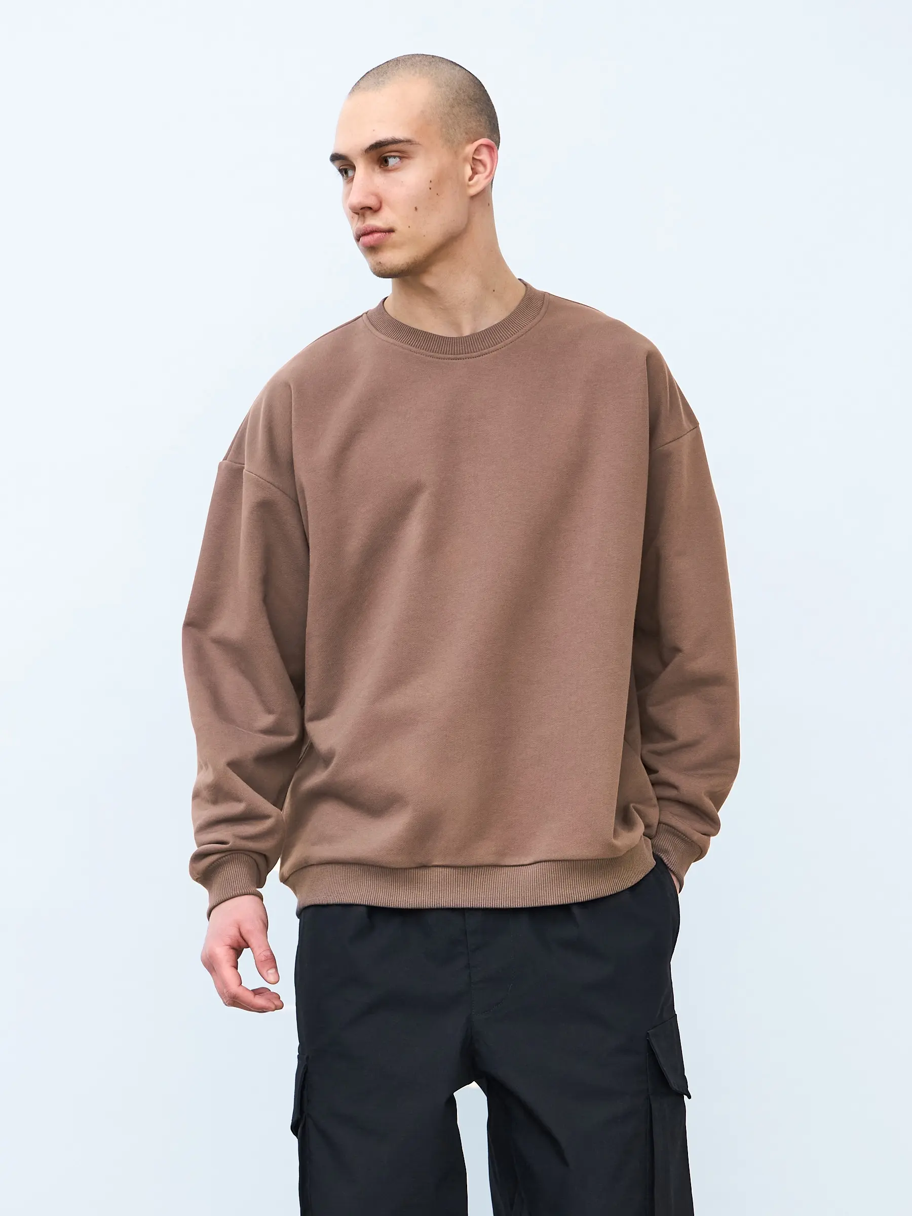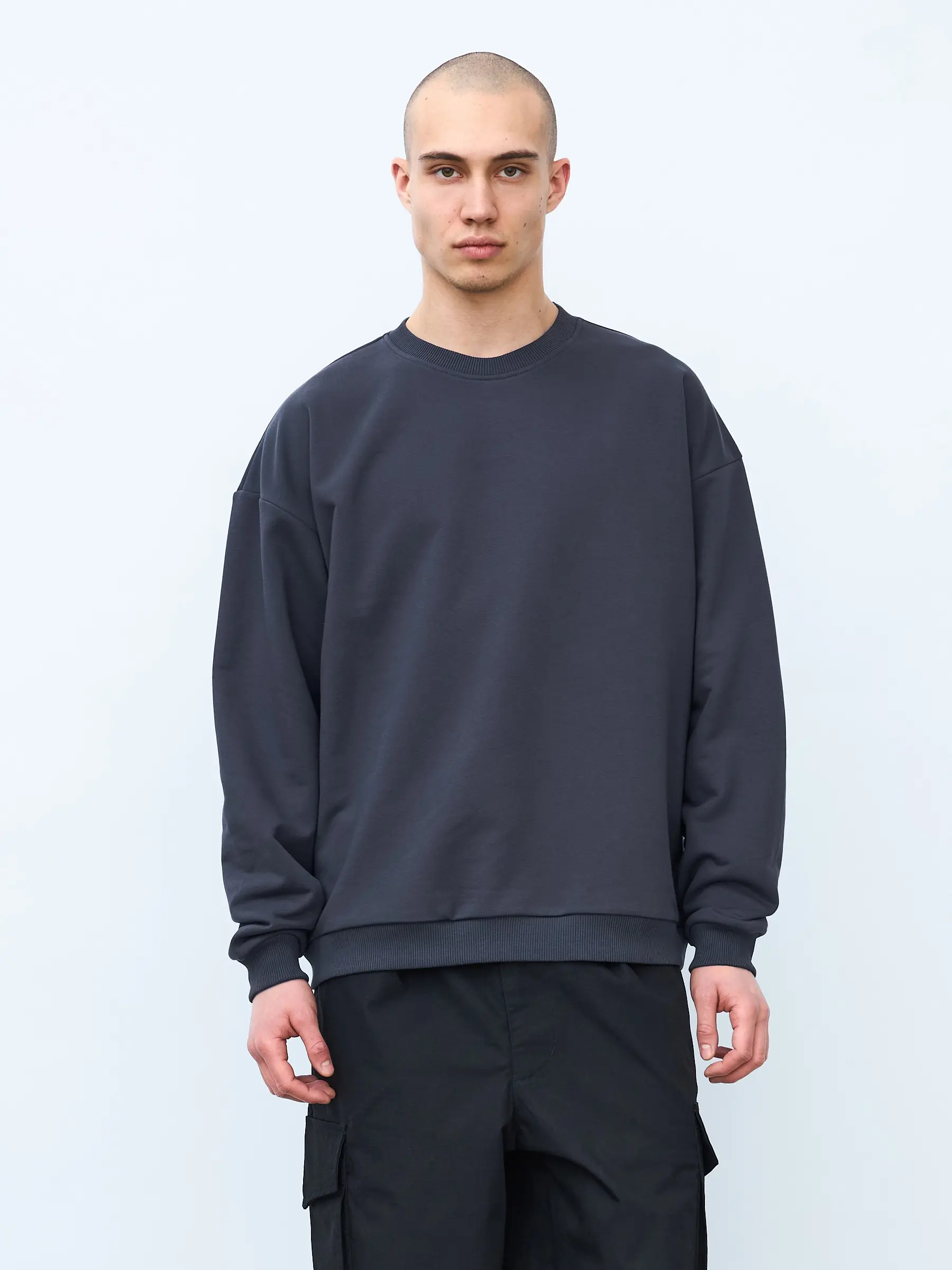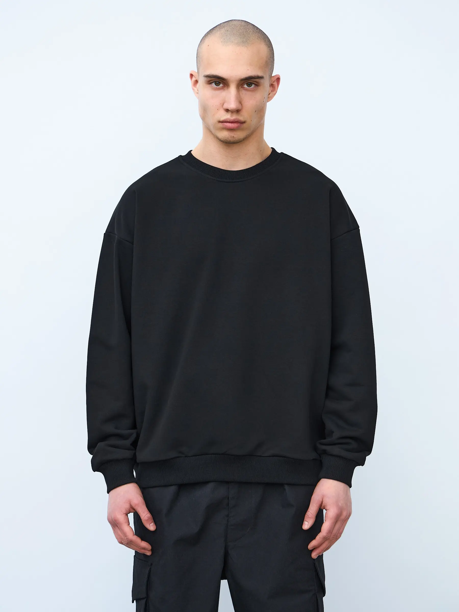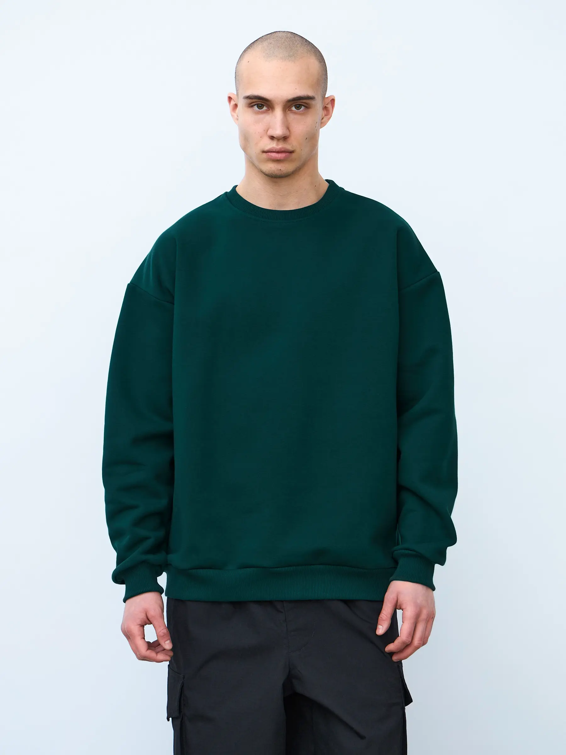 Свитшот оверсайз кроя, выполнен из трикотажного полотна "футер", с петельной изнаночной стороной. Свободный силуэт, средняя длина и спущенная линия плеча. Манжеты и пояс выполнены из ребристого эластичного полотна "кашкорсе". Во внутренней стороне горловина по спинке усилена хлопковой киперной лентой, по центру вшит тканевый жаккардовый размерник черного цвета, на внутреннем боковом шве имеется нейлоновый составник. Толстовки не имеют брендированных обозначений и индивидуально упакованы в ПВД пакет.
