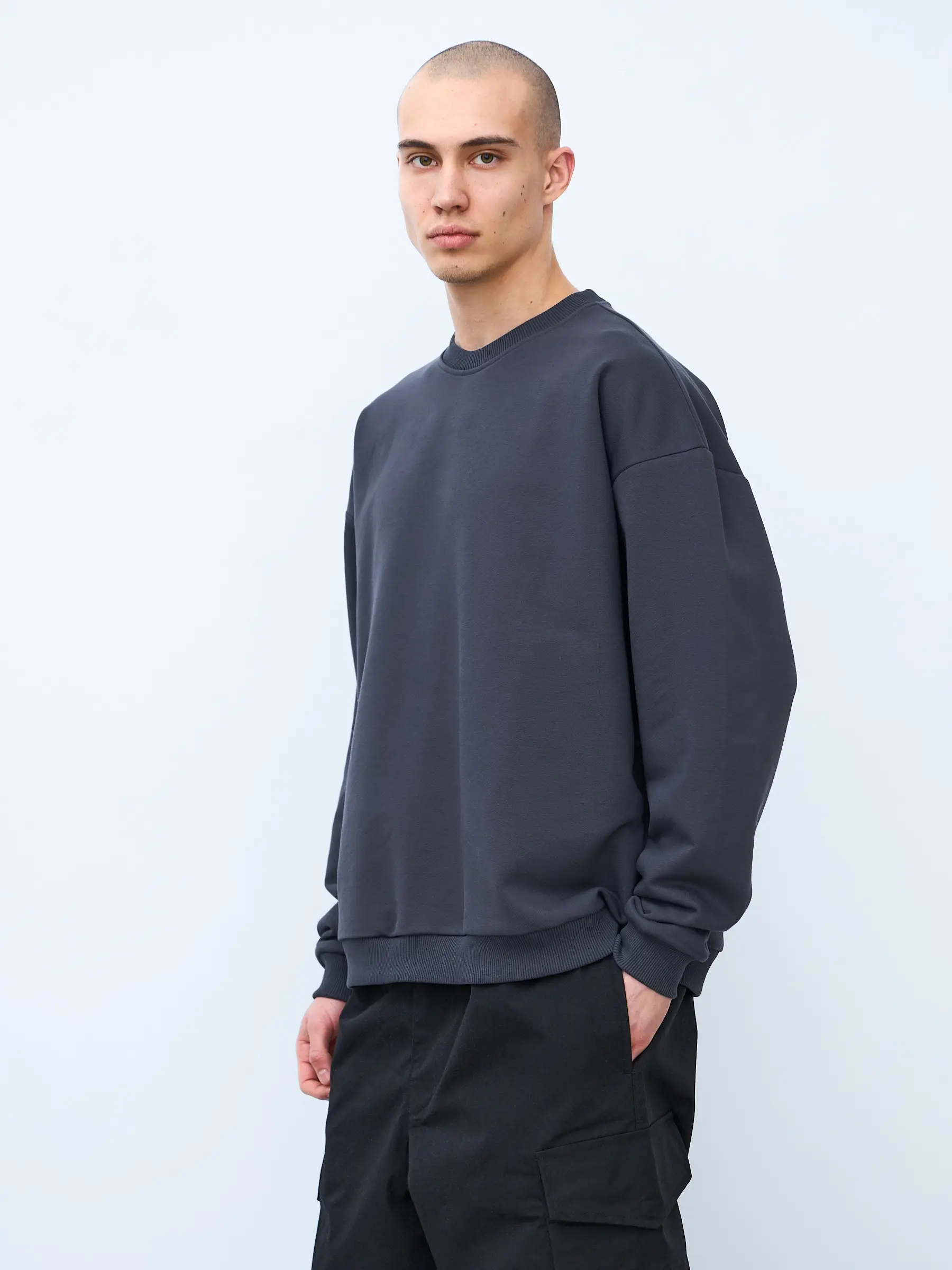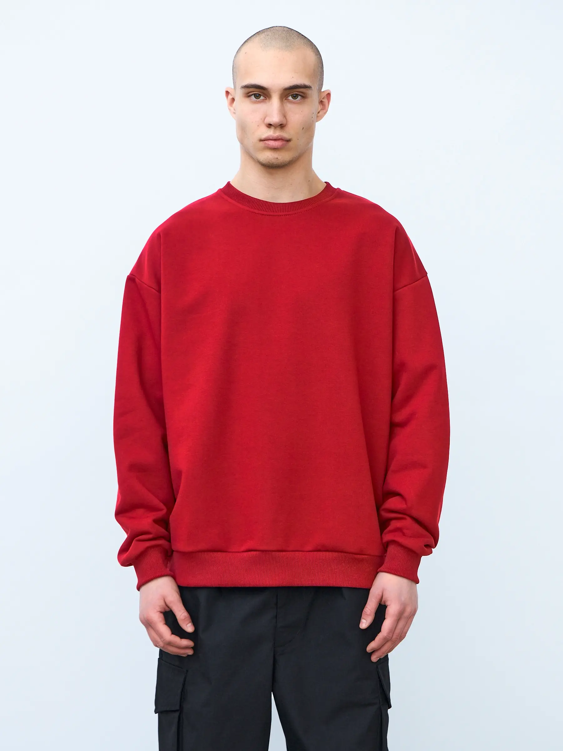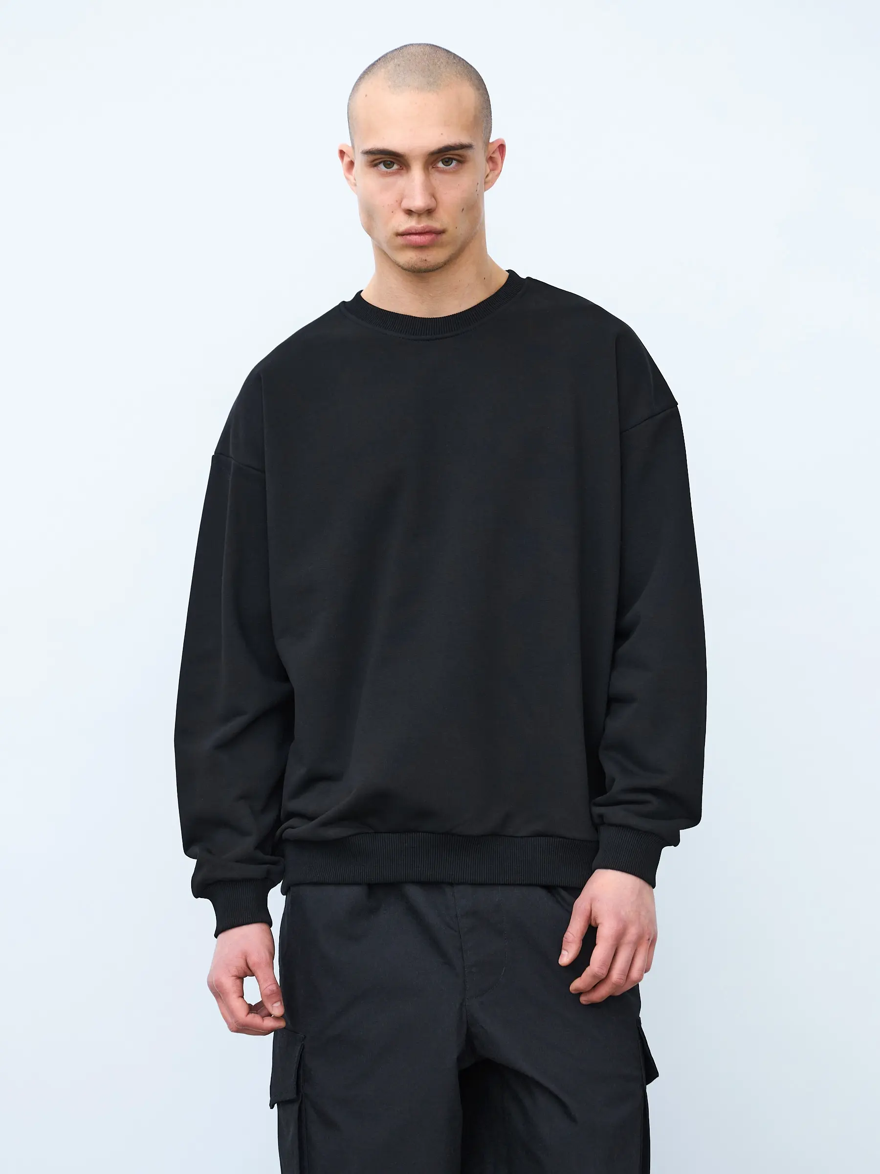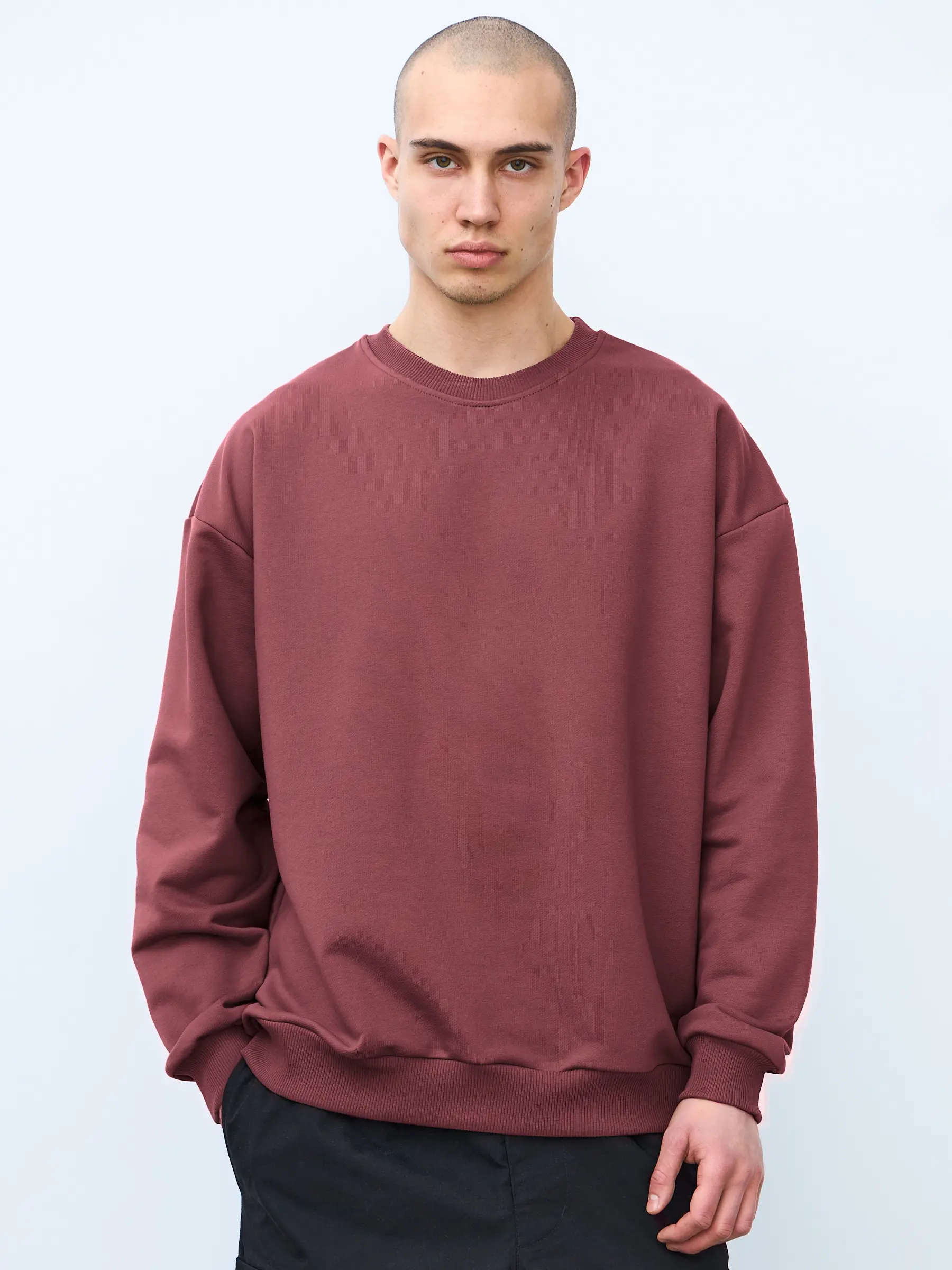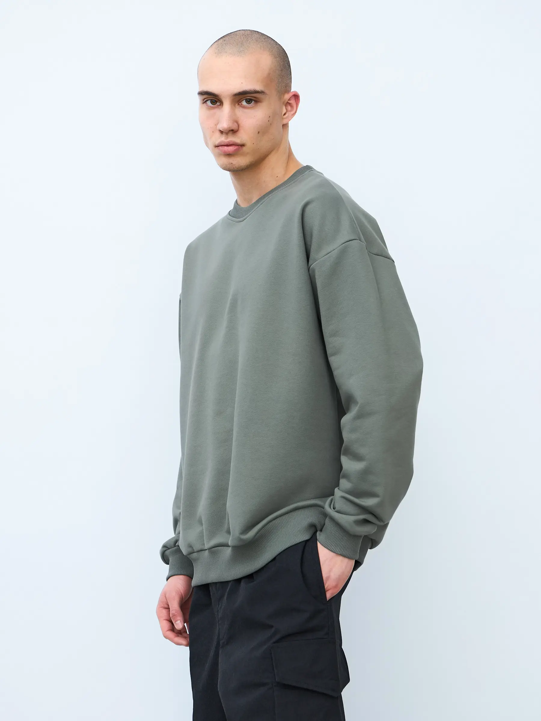 Свитшот оверсайз кроя, выполнен из трикотажного полотна "футер", с петельной изнаночной стороной. Свободный силуэт, средняя длина и спущенная линия плеча. Манжеты и пояс выполнены из ребристого эластичного полотна "кашкорсе". Во внутренней стороне горловина по спинке усилена хлопковой киперной лентой, по центру вшит тканевый жаккардовый размерник черного цвета, на внутреннем боковом шве имеется нейлоновый составник. Толстовки не имеют брендированных обозначений и индивидуально упакованы в ПВД пакет.