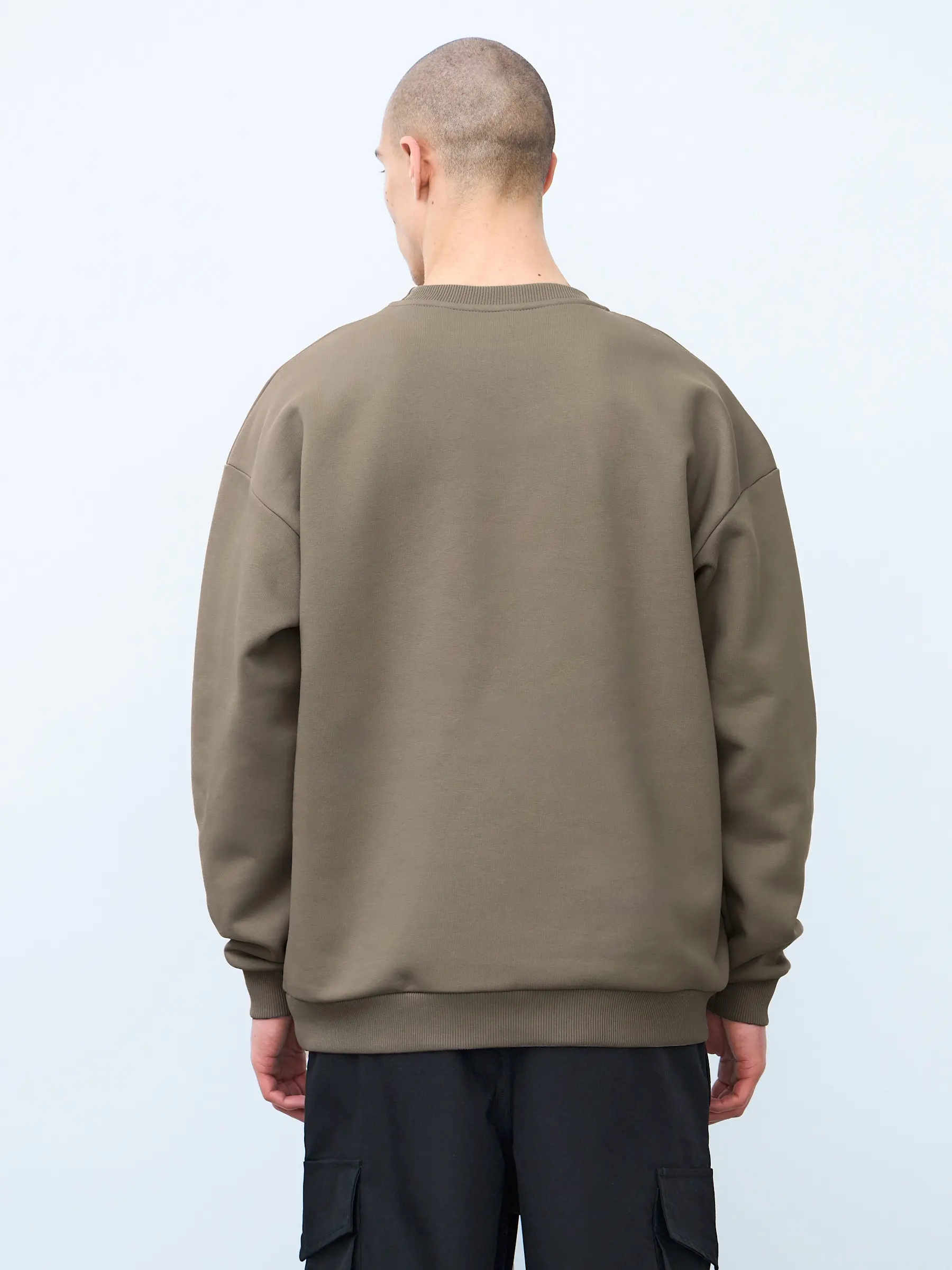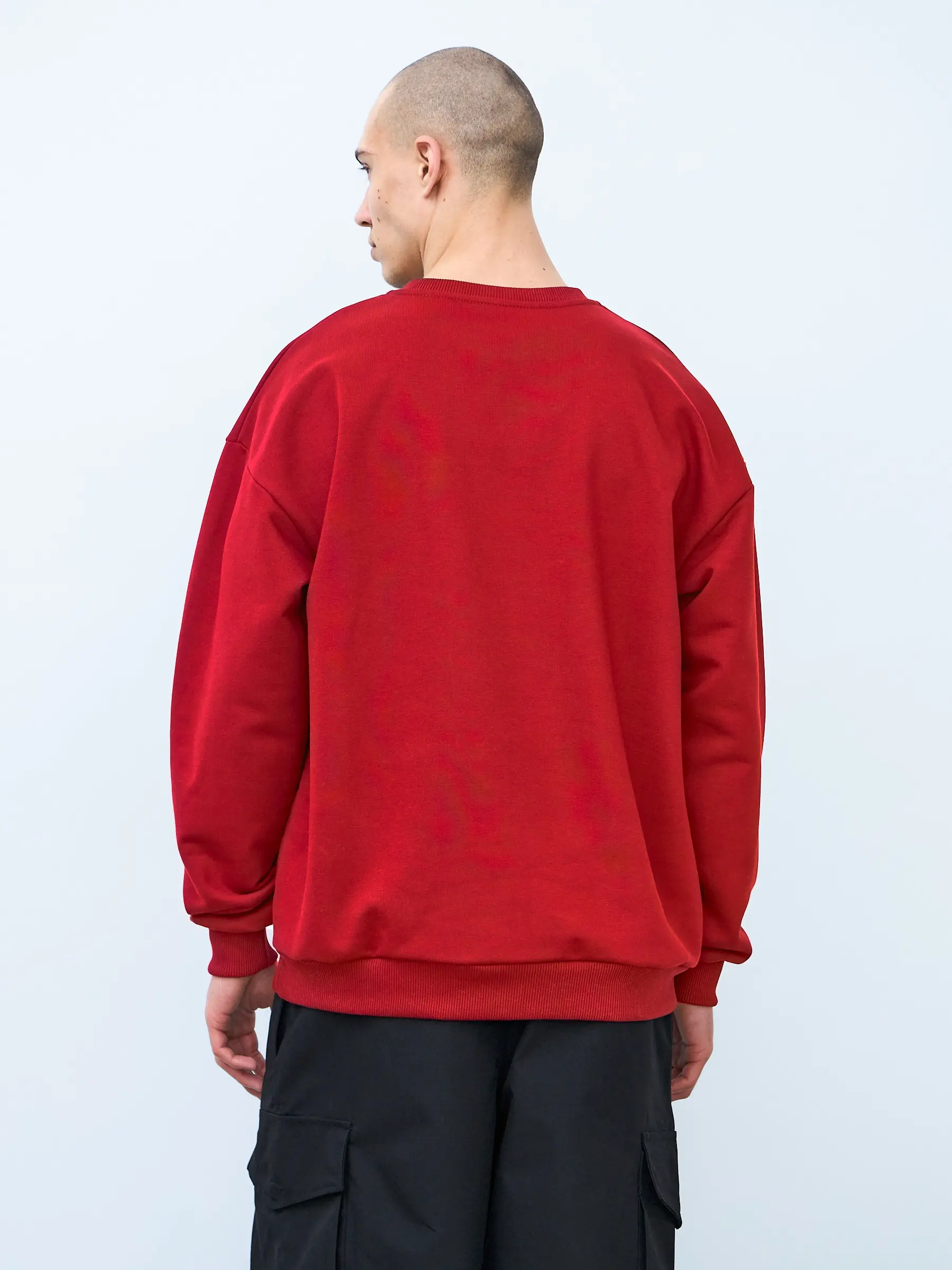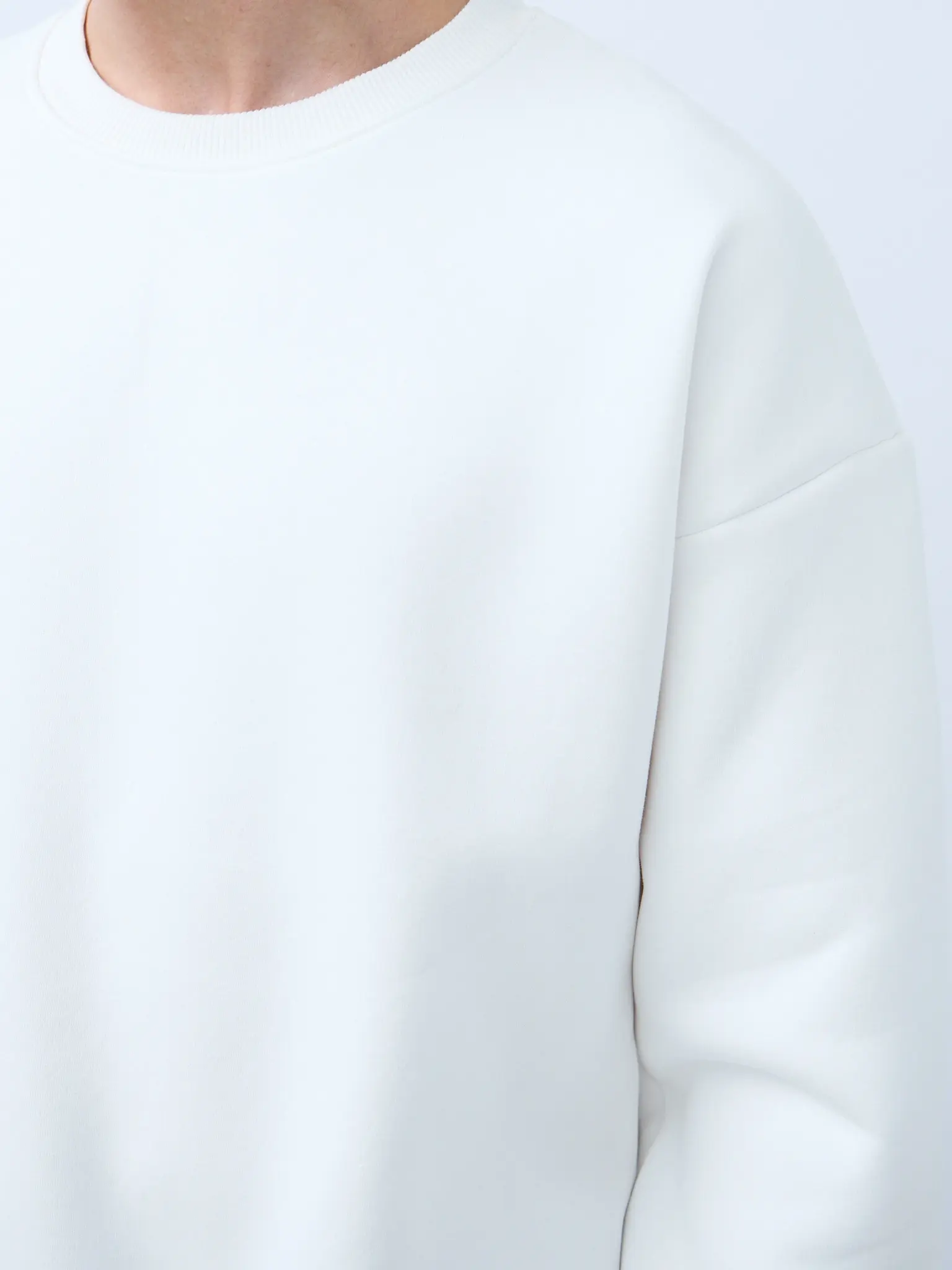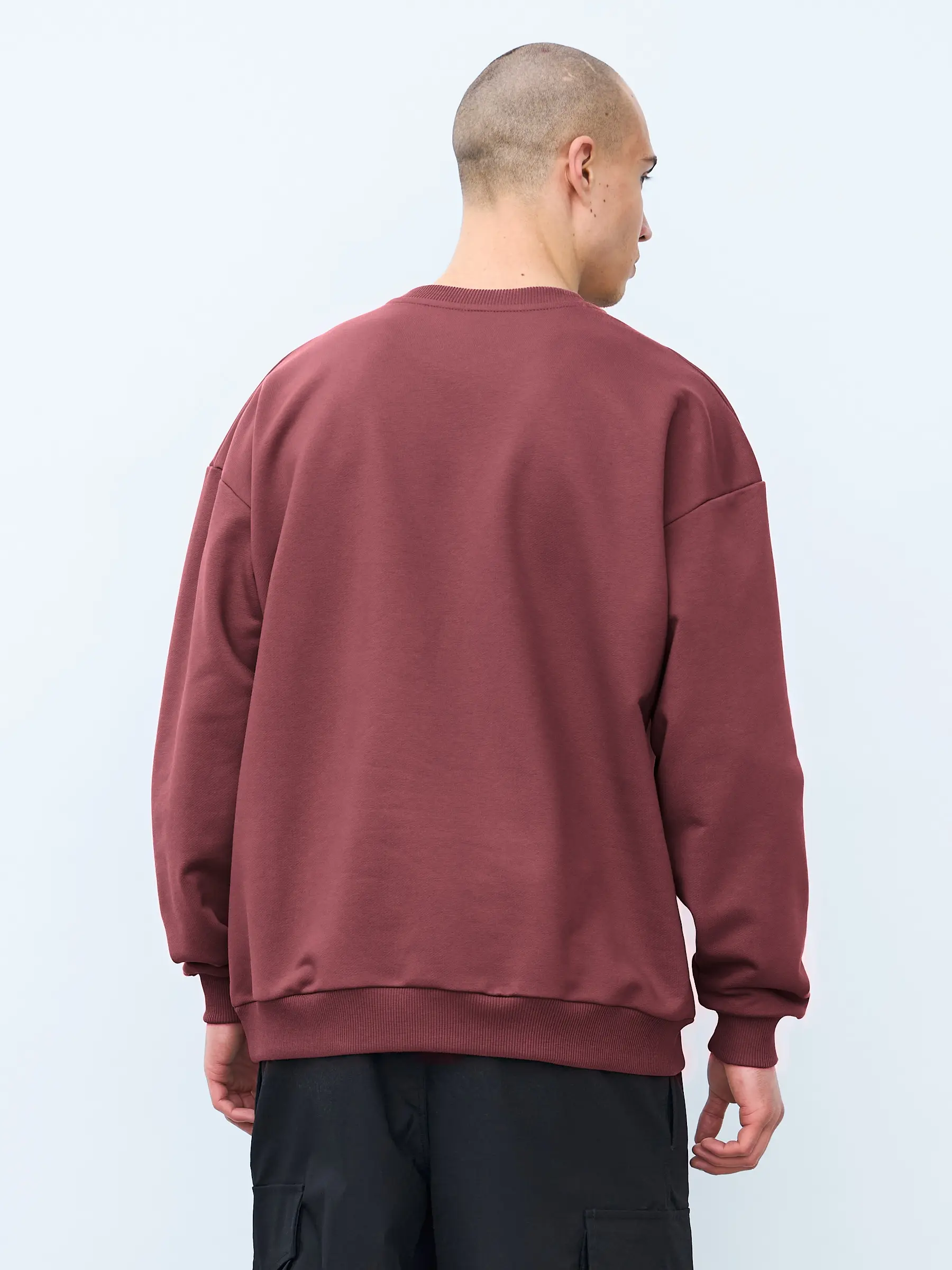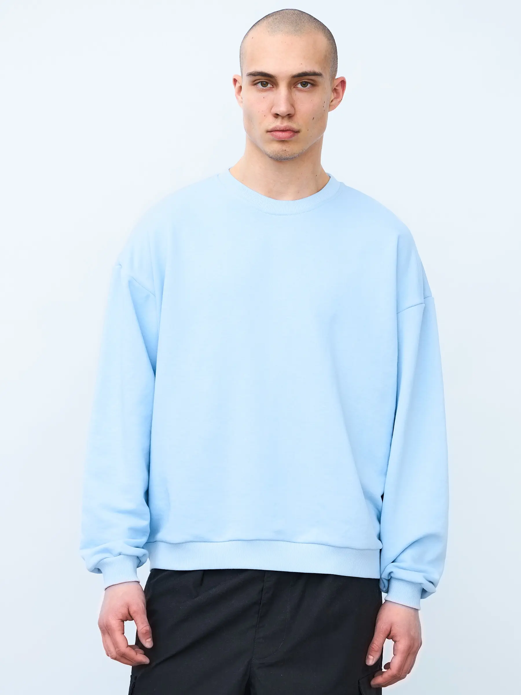 Свитшот оверсайз кроя, выполнен из трикотажного полотна "футер", с петельной изнаночной стороной. Свободный силуэт, средняя длина и спущенная линия плеча. Манжеты и пояс выполнены из ребристого эластичного полотна "кашкорсе". Во внутренней стороне горловина по спинке усилена хлопковой киперной лентой, по центру вшит тканевый жаккардовый размерник черного цвета, на внутреннем боковом шве имеется нейлоновый составник. Толстовки не имеют брендированных обозначений и индивидуально упакованы в ПВД пакет.