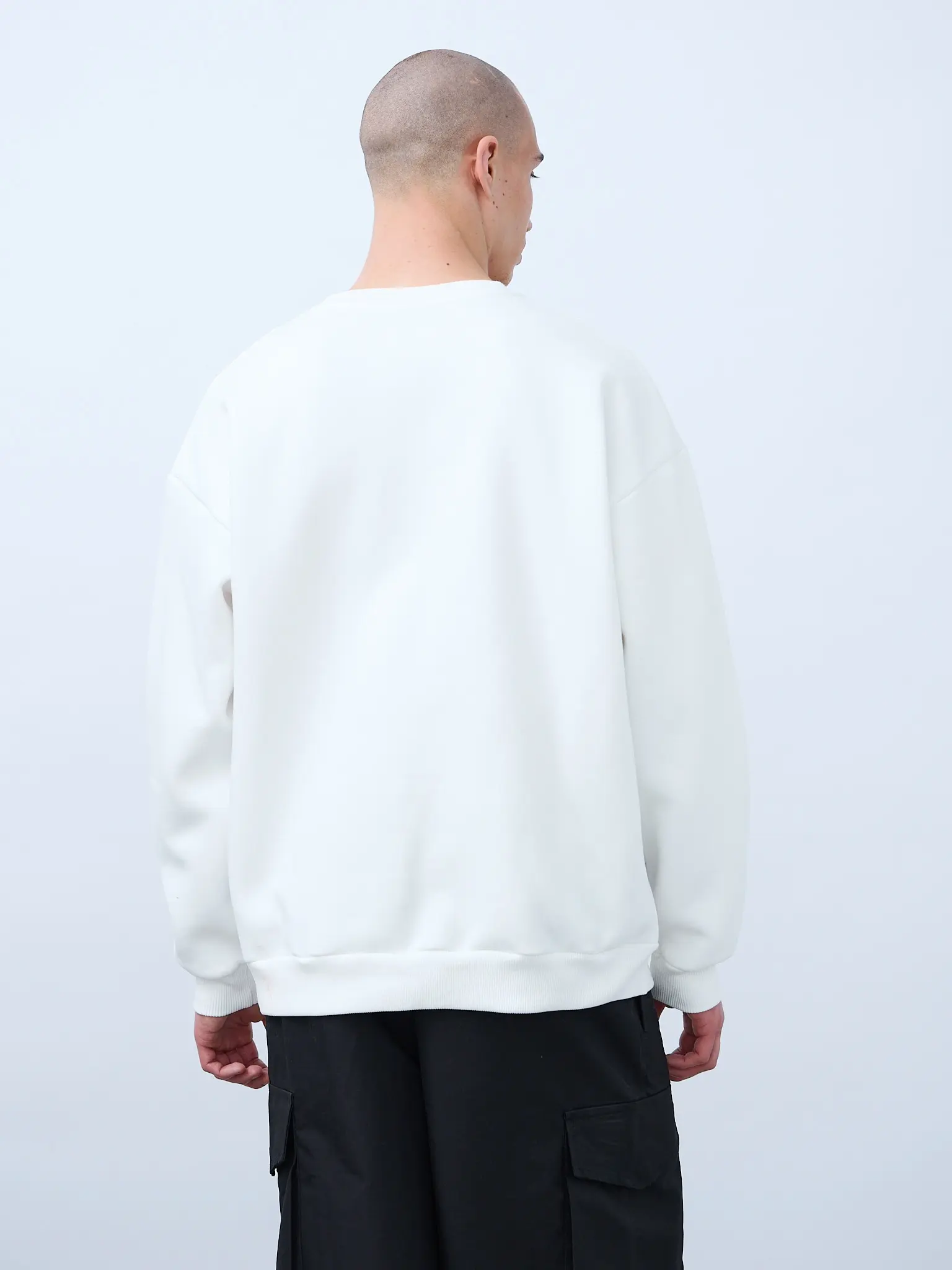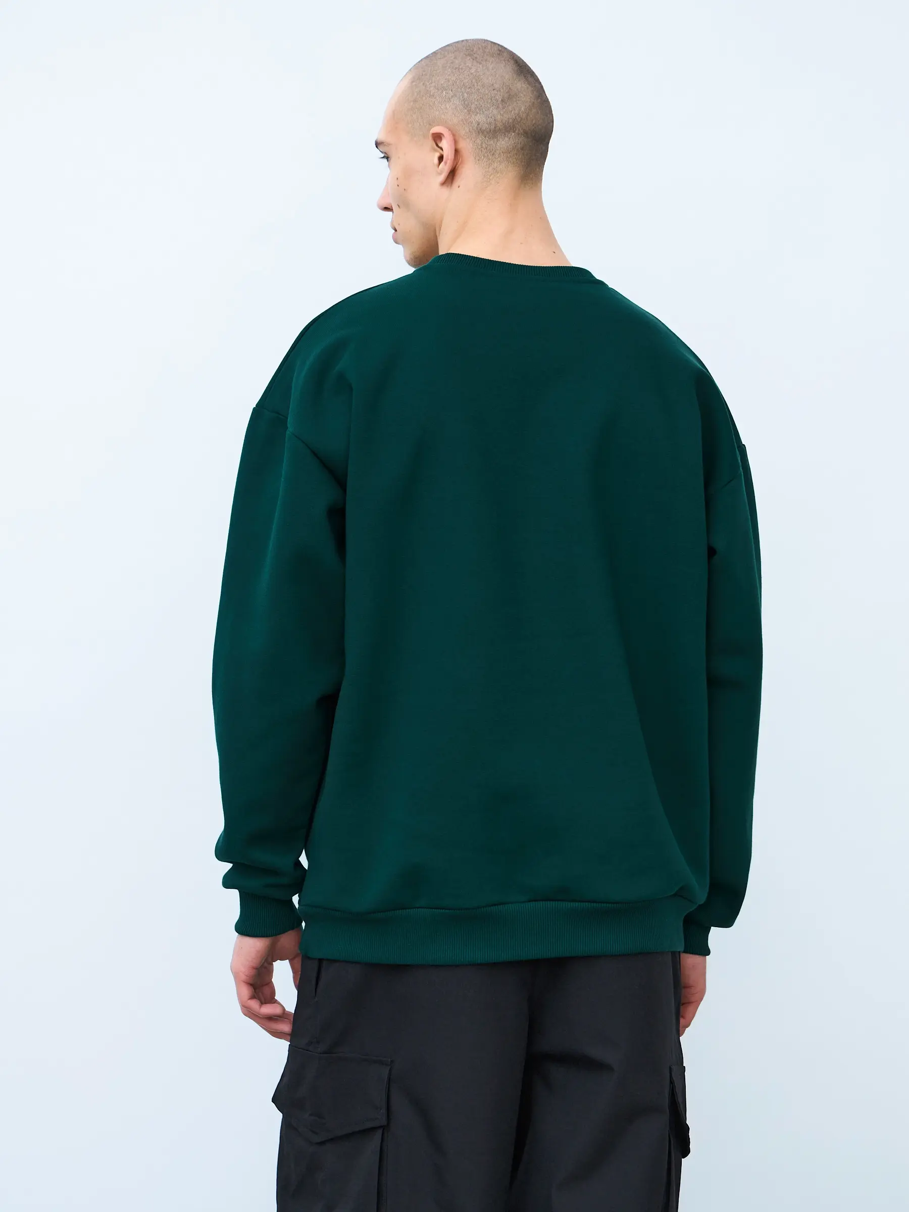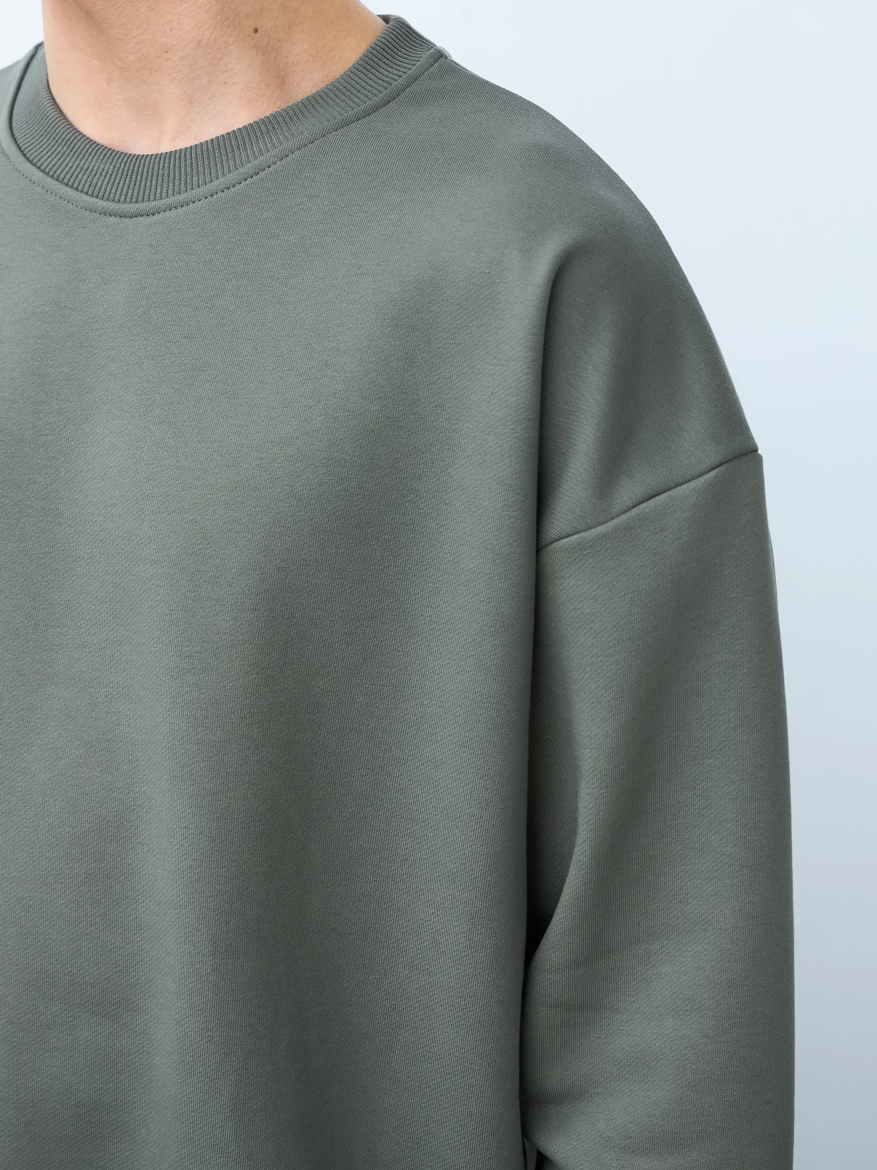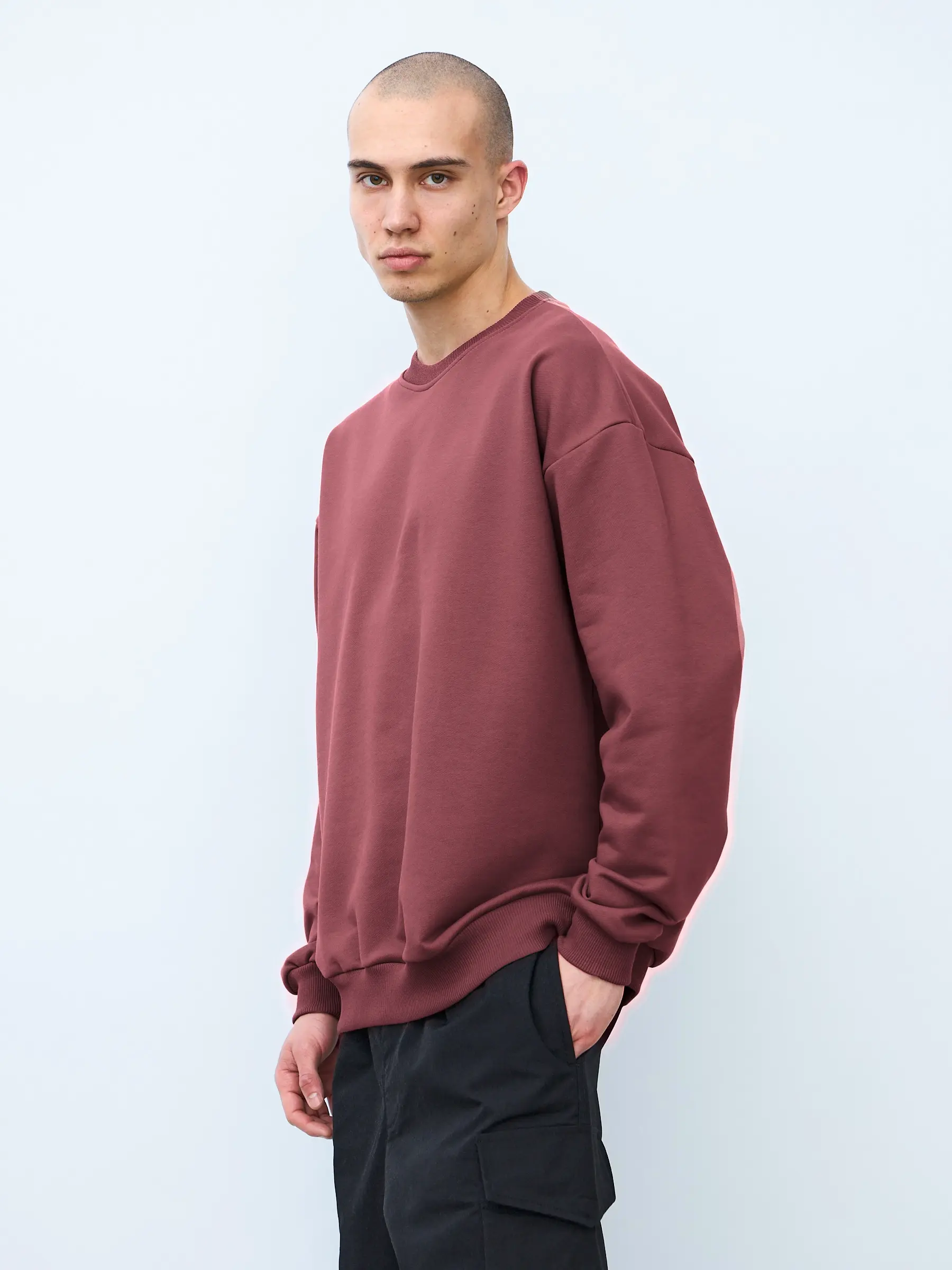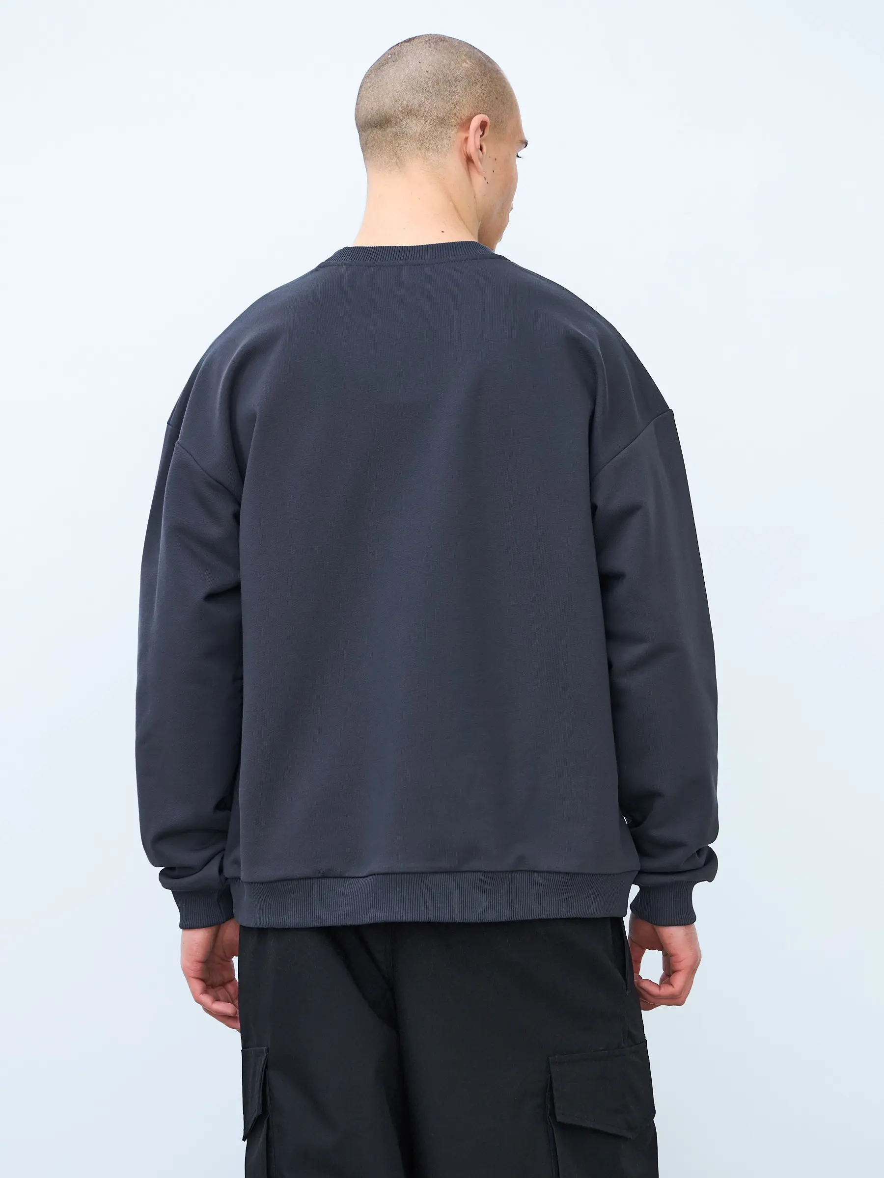 Свитшот оверсайз кроя, выполнен из трикотажного полотна "футер", с петельной изнаночной стороной. Свободный силуэт, средняя длина и спущенная линия плеча. Манжеты и пояс выполнены из ребристого эластичного полотна "кашкорсе". Во внутренней стороне горловина по спинке усилена хлопковой киперной лентой, по центру вшит тканевый жаккардовый размерник черного цвета, на внутреннем боковом шве имеется нейлоновый составник. Толстовки не имеют брендированных обозначений и индивидуально упакованы в ПВД пакет.