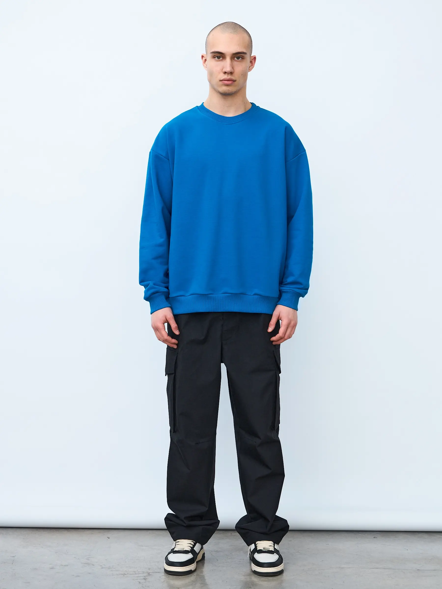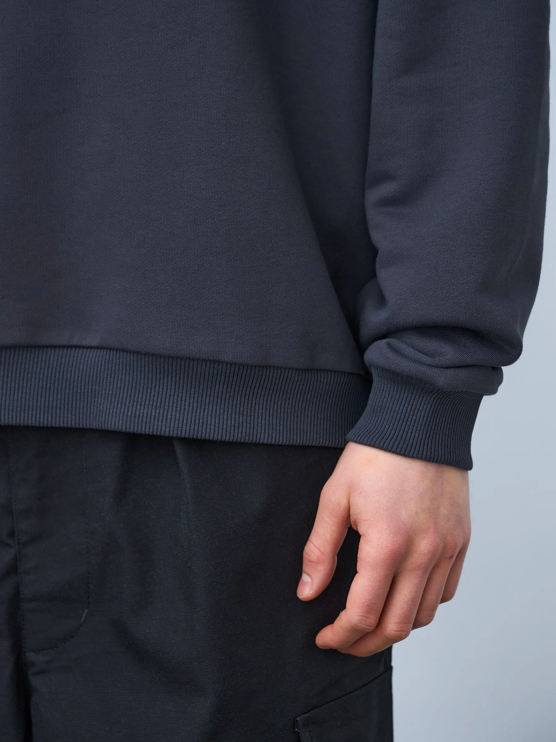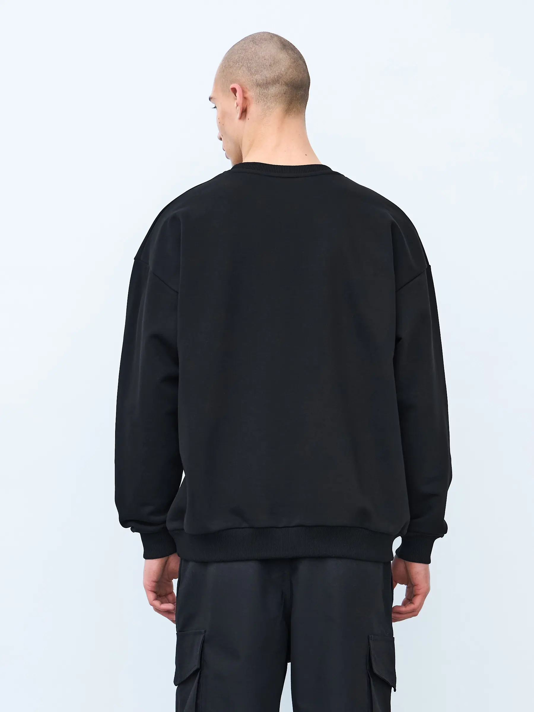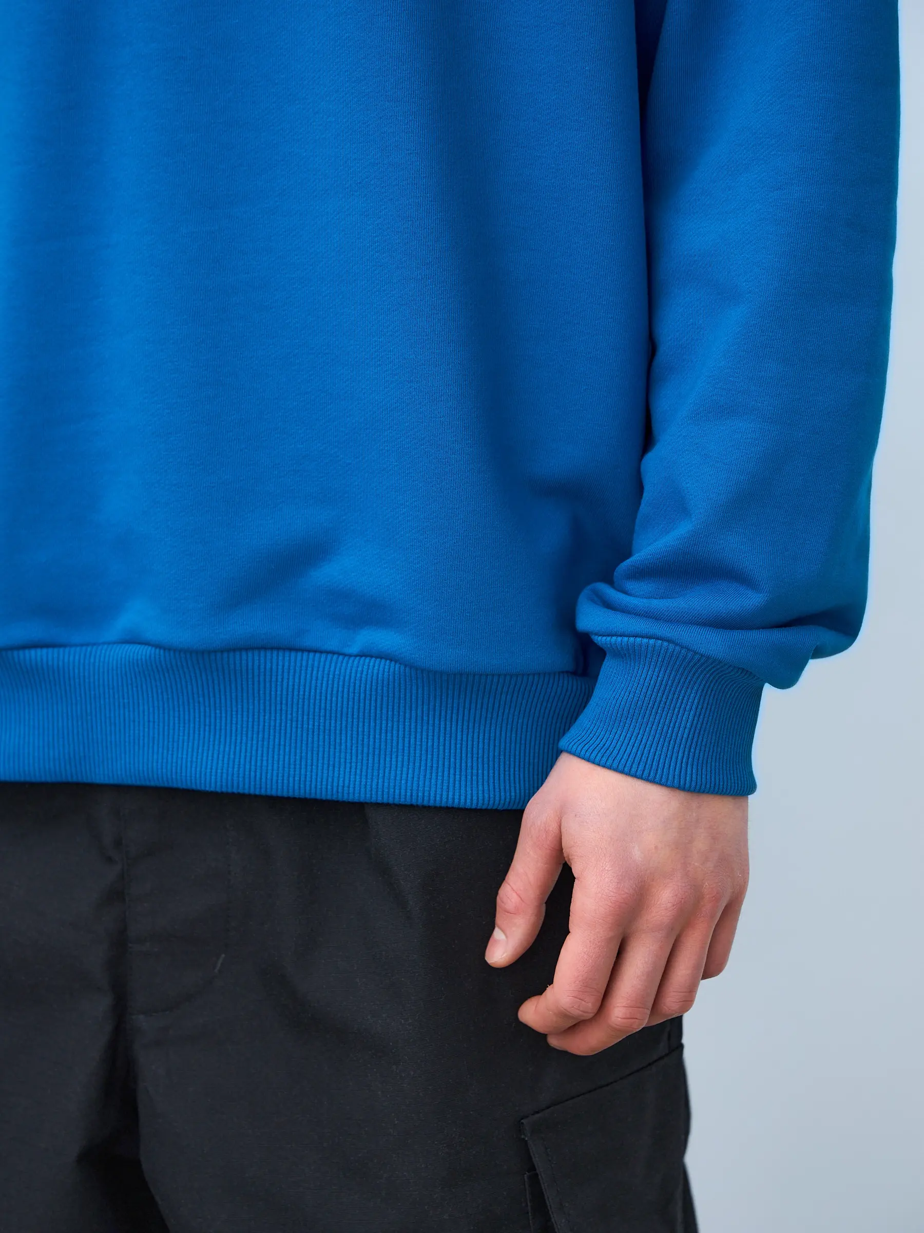 Свитшот оверсайз кроя, выполнен из трикотажного полотна "футер", с петельной изнаночной стороной. Свободный силуэт, средняя длина и спущенная линия плеча. Манжеты и пояс выполнены из ребристого эластичного полотна "кашкорсе". Во внутренней стороне горловина по спинке усилена хлопковой киперной лентой, по центру вшит тканевый жаккардовый размерник черного цвета, на внутреннем боковом шве имеется нейлоновый составник. Толстовки не имеют брендированных обозначений и индивидуально упакованы в ПВД пакет.