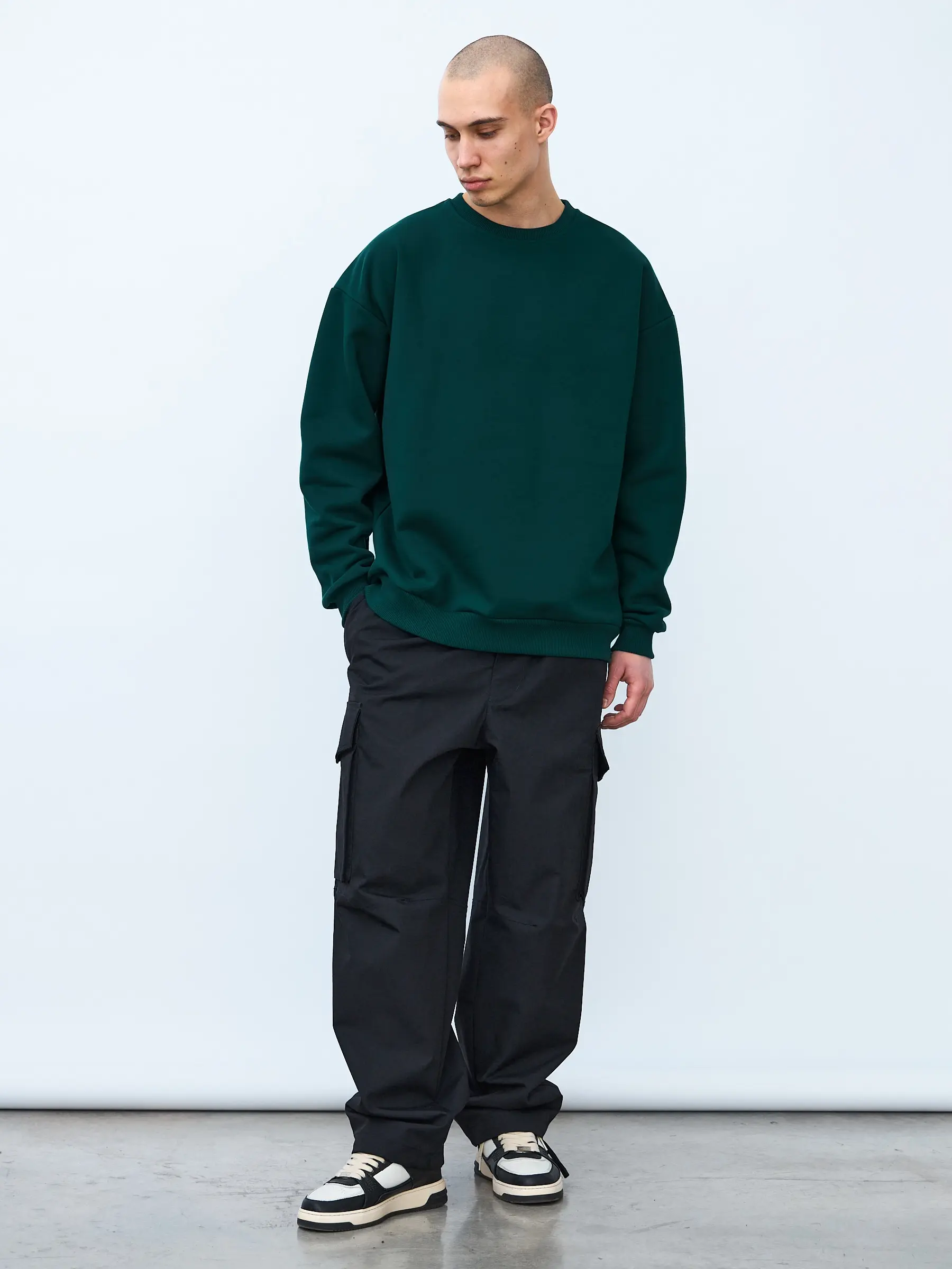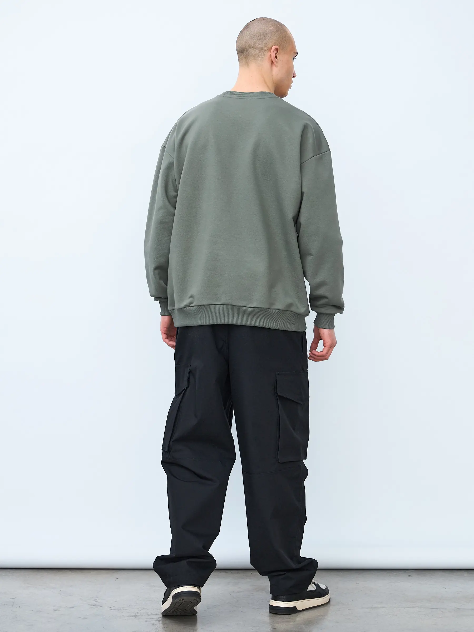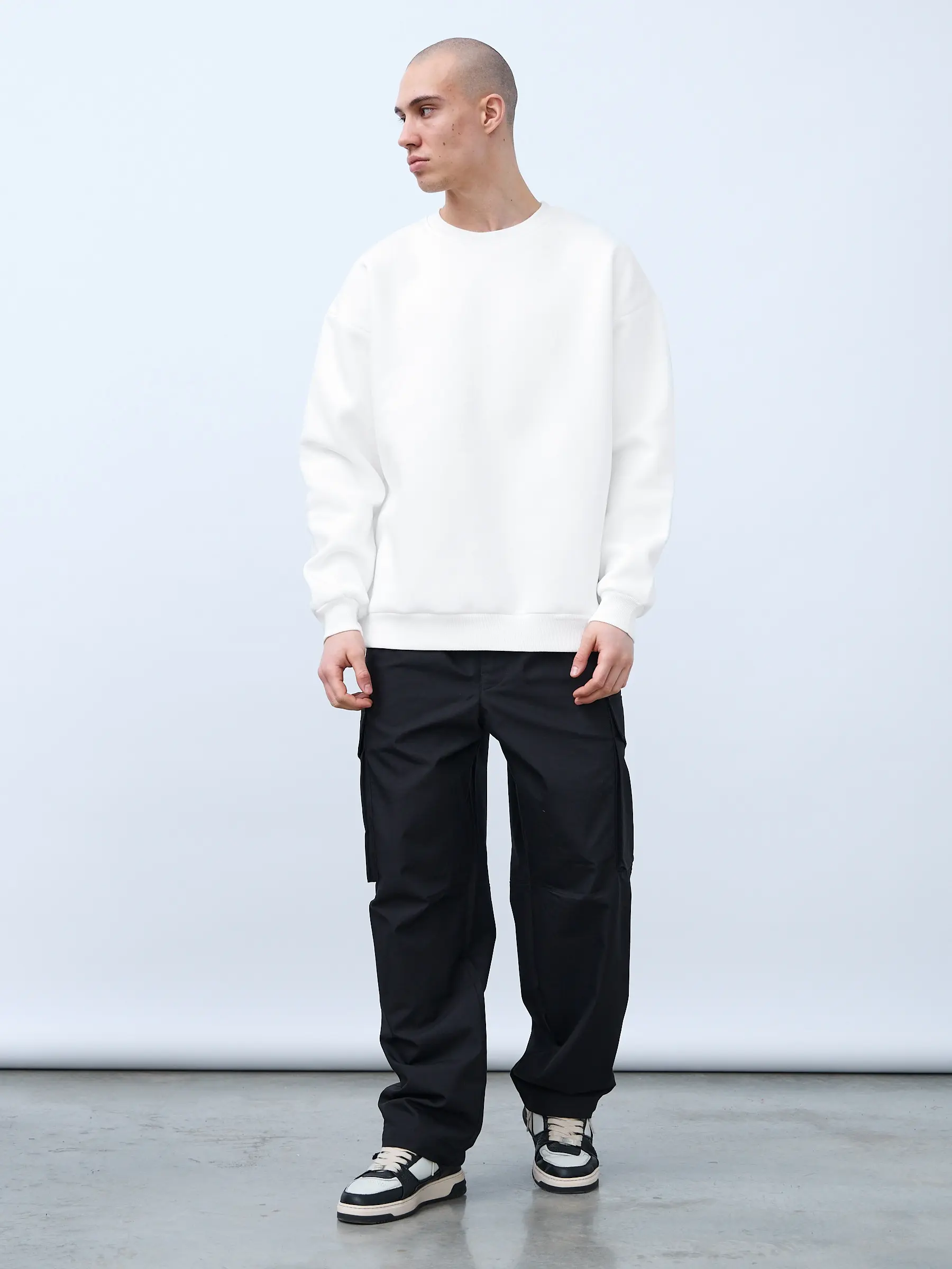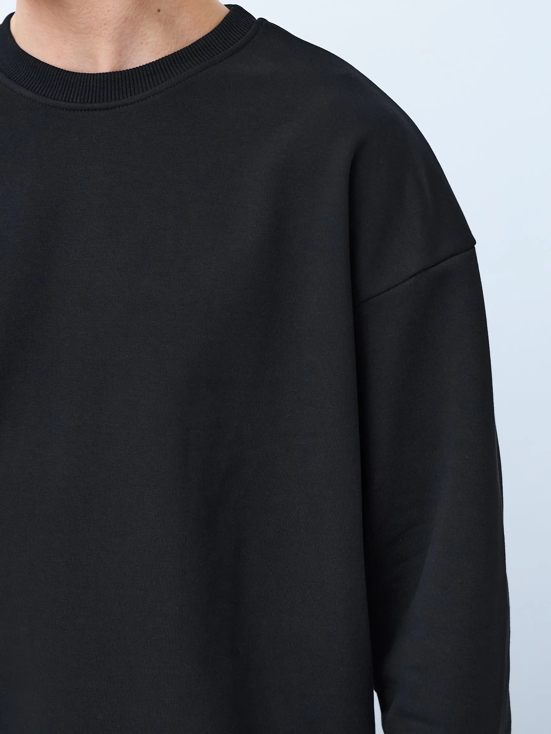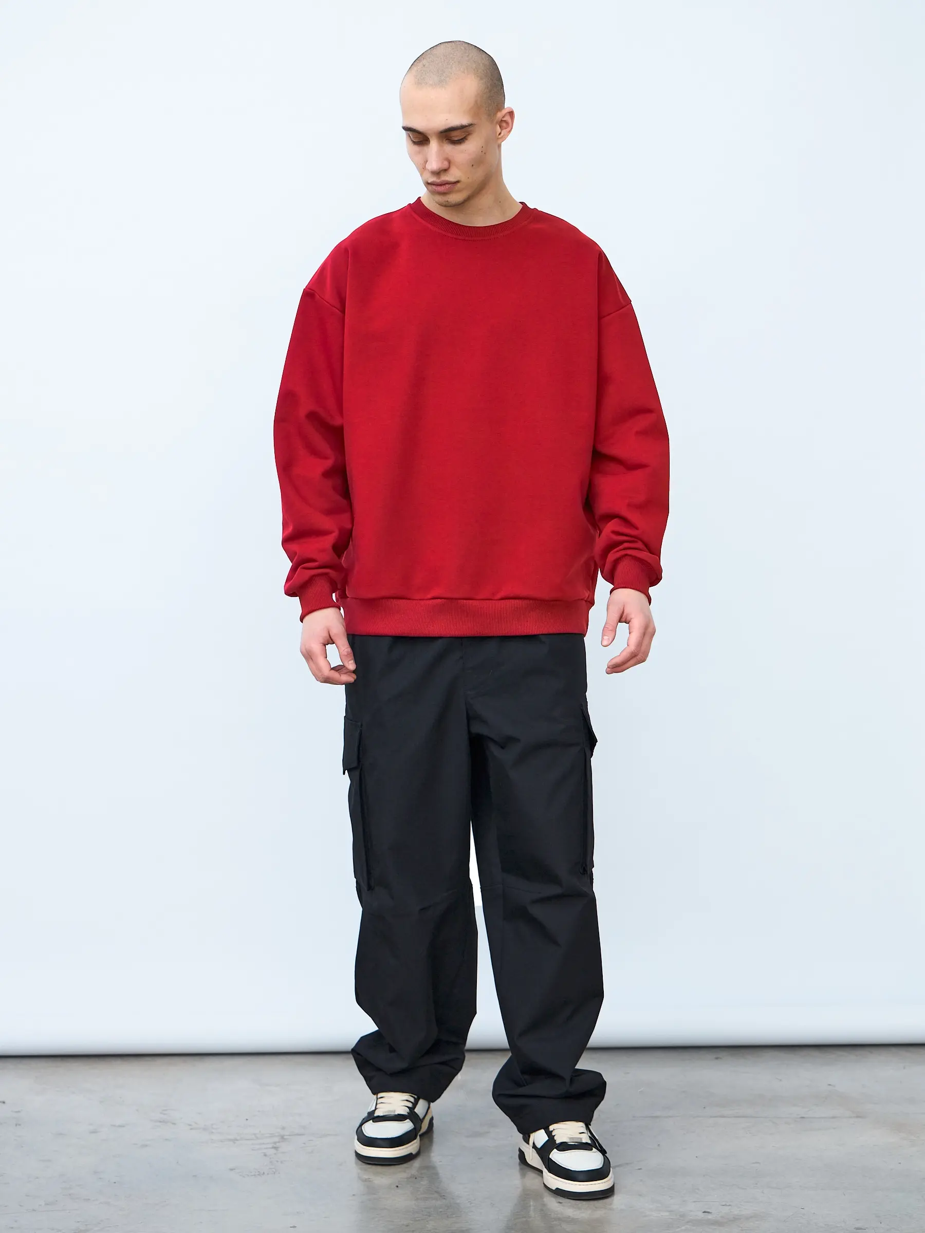 Свитшот оверсайз кроя, выполнен из трикотажного полотна "футер", с петельной изнаночной стороной. Свободный силуэт, средняя длина и спущенная линия плеча. Манжеты и пояс выполнены из ребристого эластичного полотна "кашкорсе". Во внутренней стороне горловина по спинке усилена хлопковой киперной лентой, по центру вшит тканевый жаккардовый размерник черного цвета, на внутреннем боковом шве имеется нейлоновый составник. Толстовки не имеют брендированных обозначений и индивидуально упакованы в ПВД пакет.