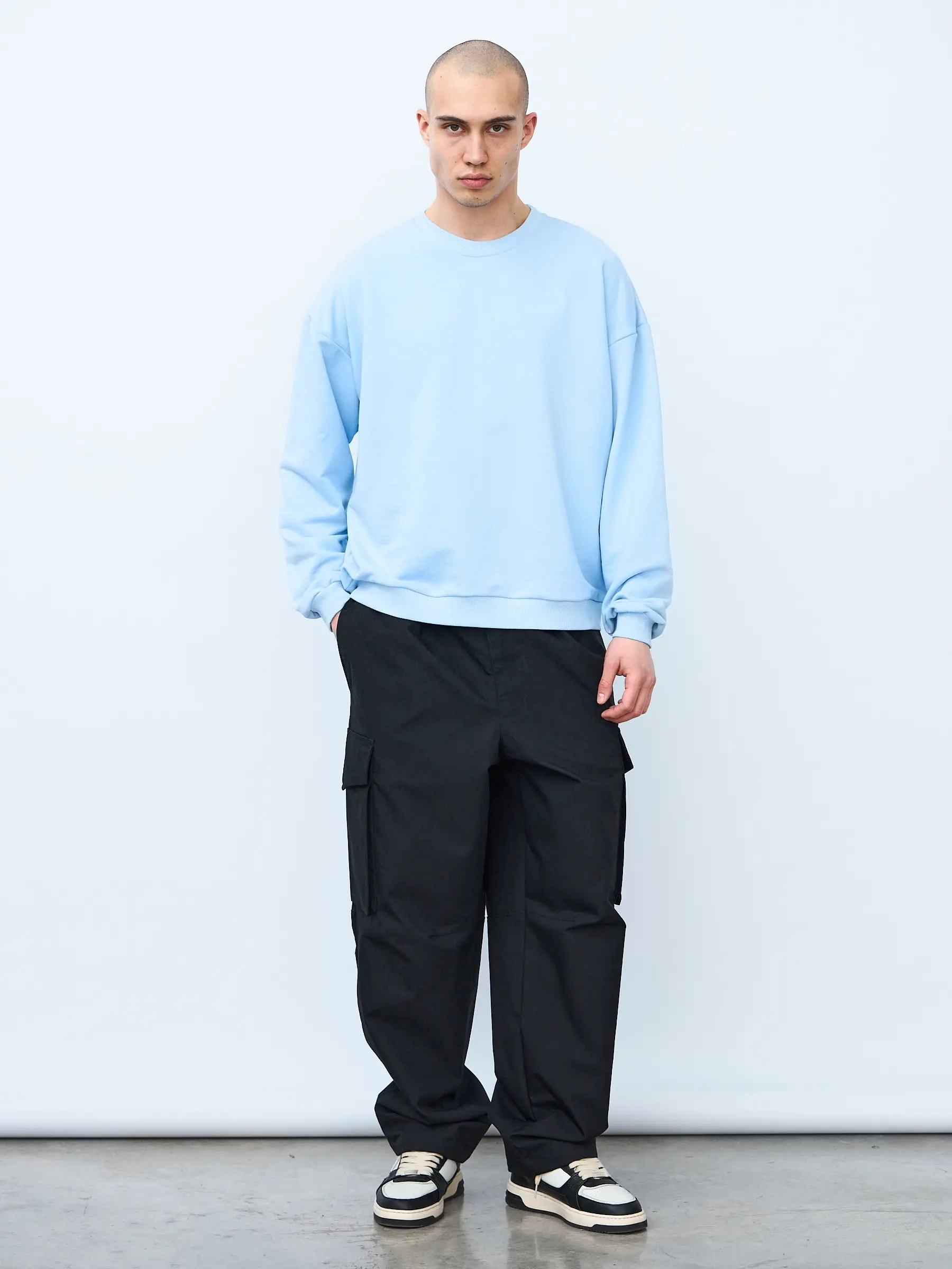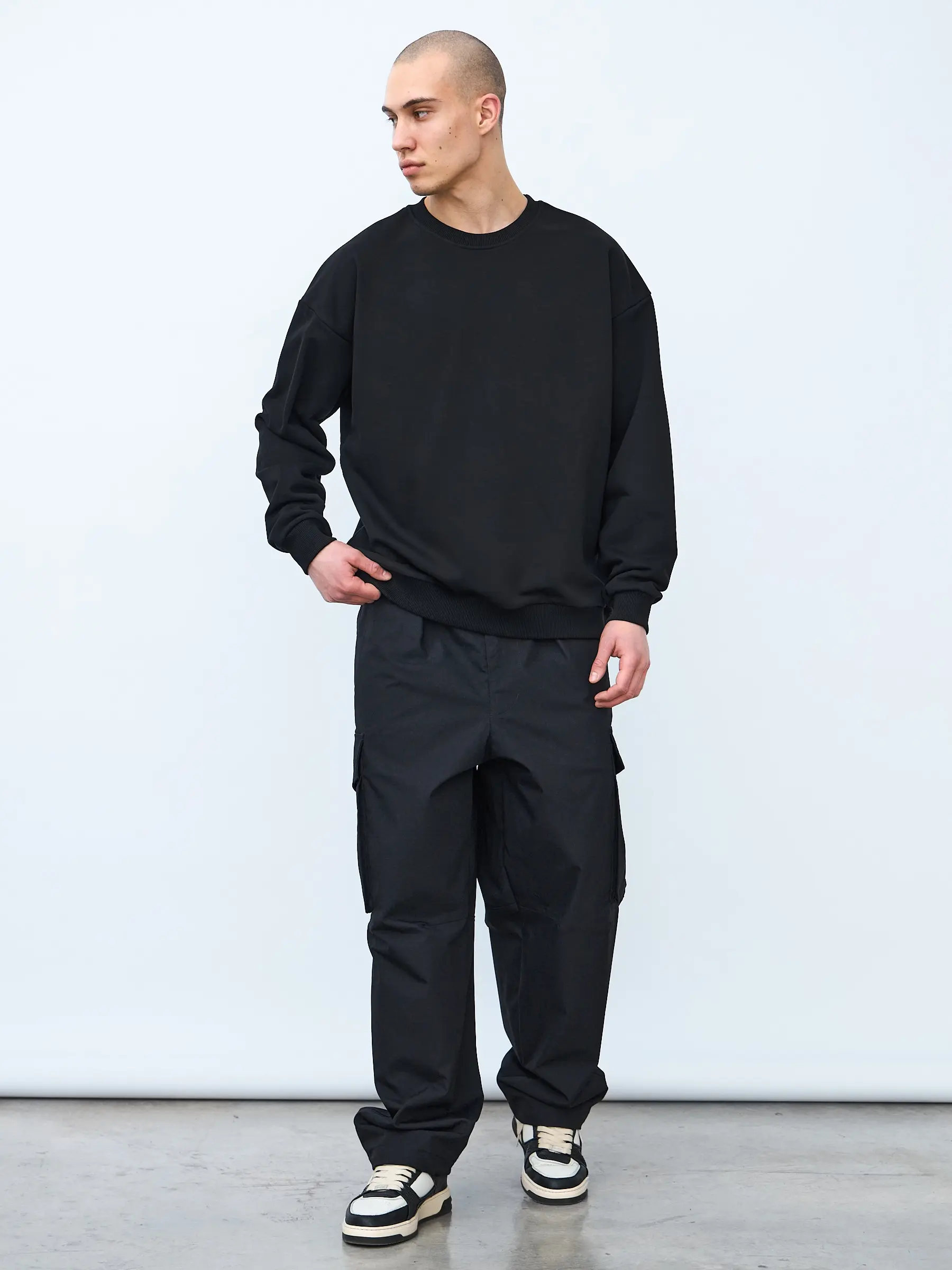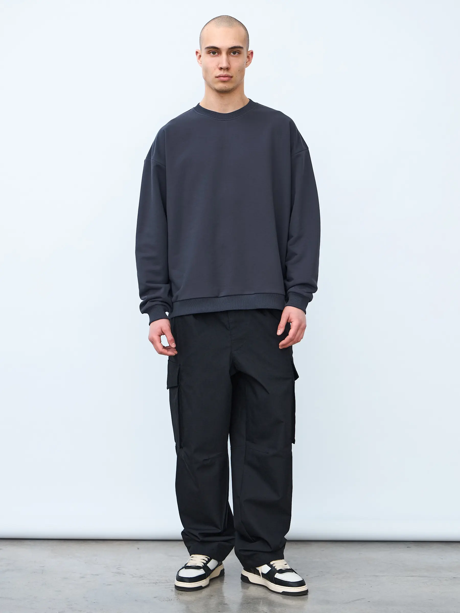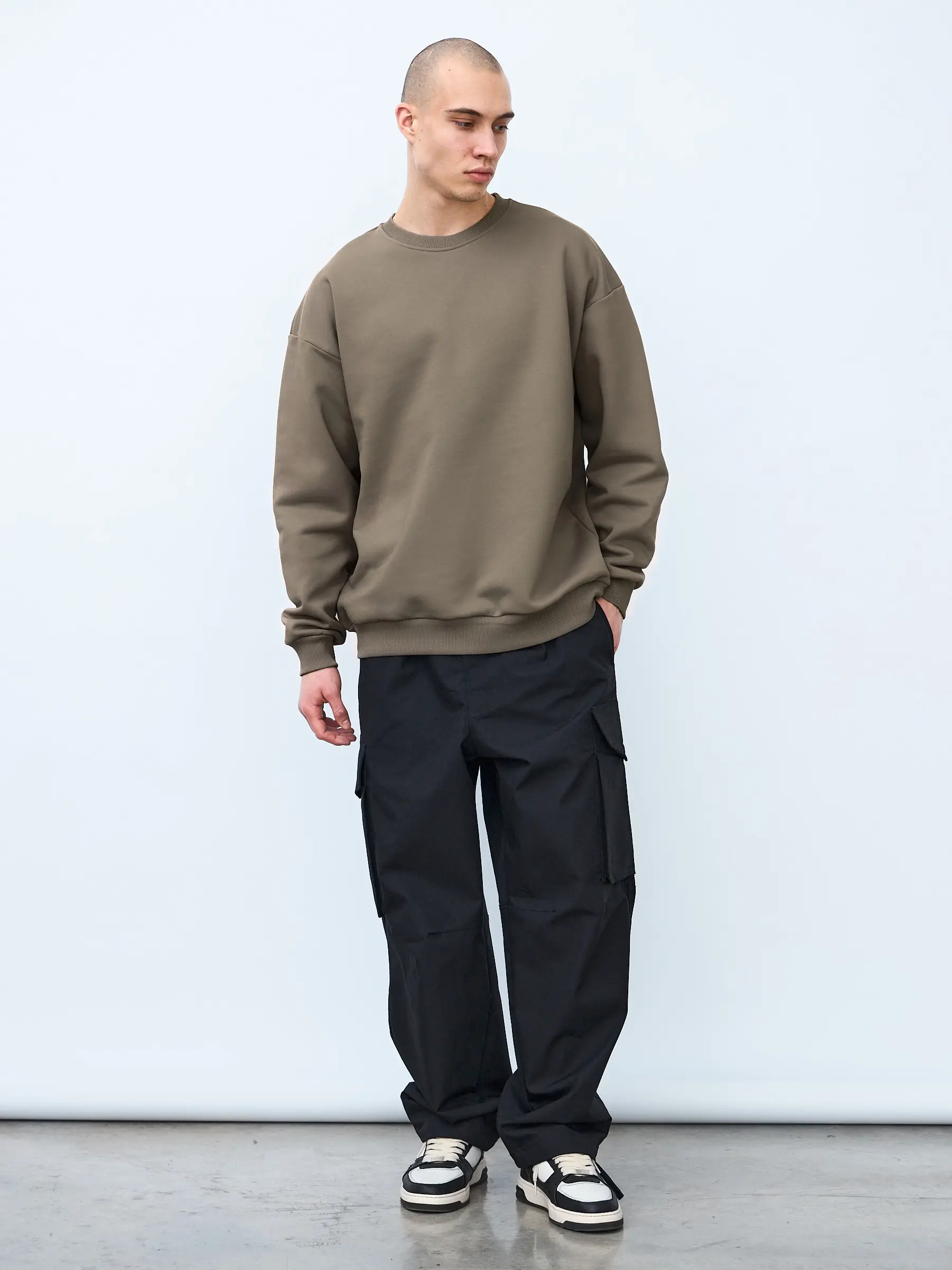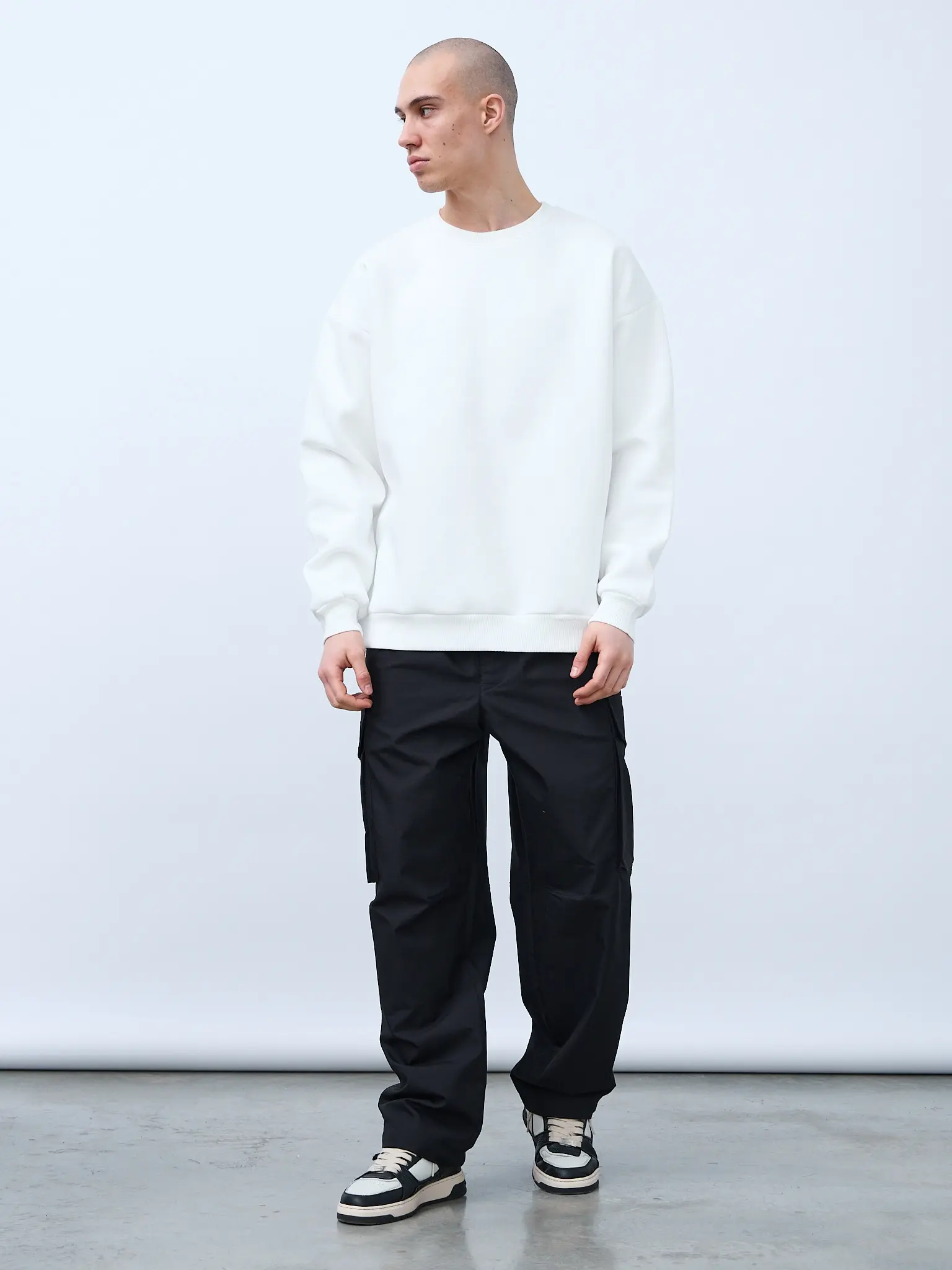 Свитшот оверсайз кроя, выполнен из трикотажного полотна "футер", с петельной изнаночной стороной. Свободный силуэт, средняя длина и спущенная линия плеча. Манжеты и пояс выполнены из ребристого эластичного полотна "кашкорсе". Во внутренней стороне горловина по спинке усилена хлопковой киперной лентой, по центру вшит тканевый жаккардовый размерник черного цвета, на внутреннем боковом шве имеется нейлоновый составник. Толстовки не имеют брендированных обозначений и индивидуально упакованы в ПВД пакет.